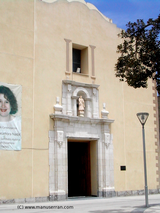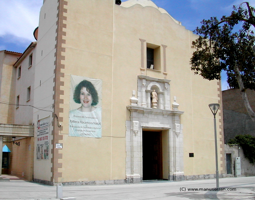 En 1603, la Ermita de San Pedro Apóstol se convirtió en Iglesia Parroquial de Granja de Rocamora. Esta ermita primitiva estaba situada en la actual plaza de San Pedro. Pasados unos años y ante el aumento poblacional se construyó la actual Iglesia de San Pedro Apóstol en un nuevo solar. Se colocó la primera piedra el 29 de agosto de 1748, y su finalización e inauguración tuvo lugar el 28 de julio de 1775…». (1)