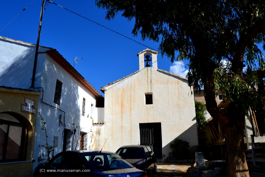 «…El edificio de la ermita está emparedado entre las viviendas y delante de la fachada tiene una pequeña explanada. Realizado con obra de mampostería y cubierta a dos aguas con teja curva. La fachada es pentagonal, cubriendo su ángulo superior una espadaña sencilla con hueco de arco de medio punto y tejadillo a dos aguas. Tiene campana del año 1859. Puerta en dintel, muy desvencijada y ventana a mitad del frontón, para dar luz a la ermita. Enjalbegada en blanco.