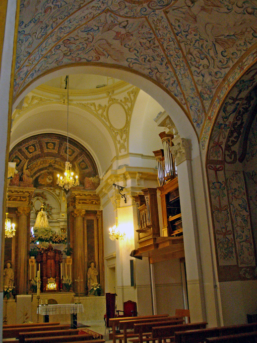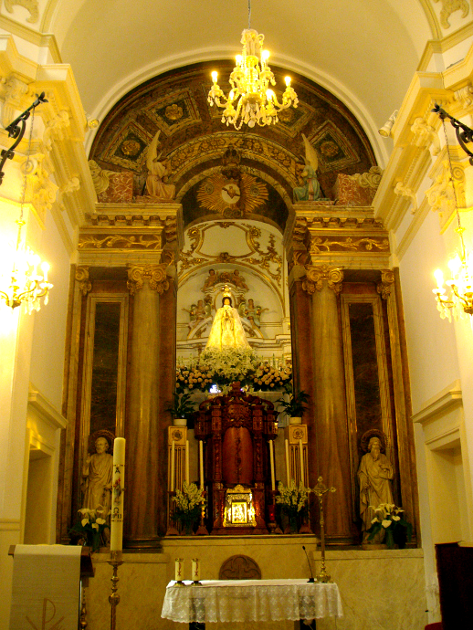 A los pies tiene coro alto, entre los contrafuertes capillas poco profundas con arco y bóveda de medio punto; a la cabecera gran retablo con dos pares de columnas y entablamento enmarcan el hueco que deja ver ampliamente el camarín, notablemente vistoso y rococó con la imagen de Nuestra Señora de las Nieves…». (3)