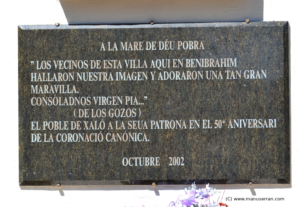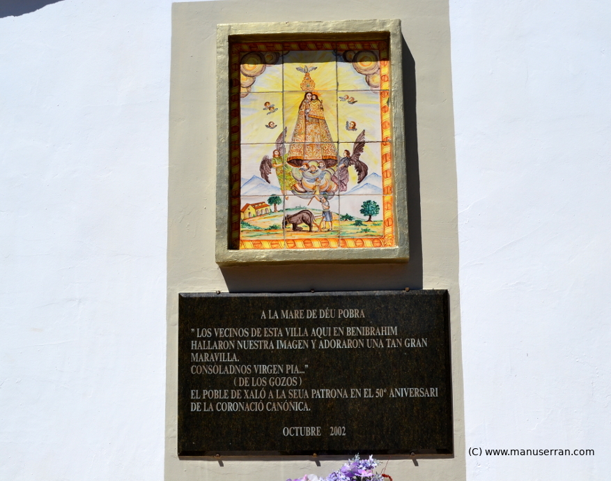 En Benibrai se encontró una imagen de la Virgen del Consuelo, conocida popularmente con el nombre la Mare de Déu Pobra Virgen Pobre por el estado lastimoso en que estaba. Se ignora por quién y en qué circunstancias fue enterrada dentro de una caja de madera. Sí se sabe, en cambio, que un vecino de Jalón llamado Canet la encontró cuando labraba su campo de Benibrai en el año 1731. Virgen Pobre (La Mare de Déu Pobra) es la Patrona de Jalón, y su festividad se celebra cada tercer lunes de octubre…». (1)