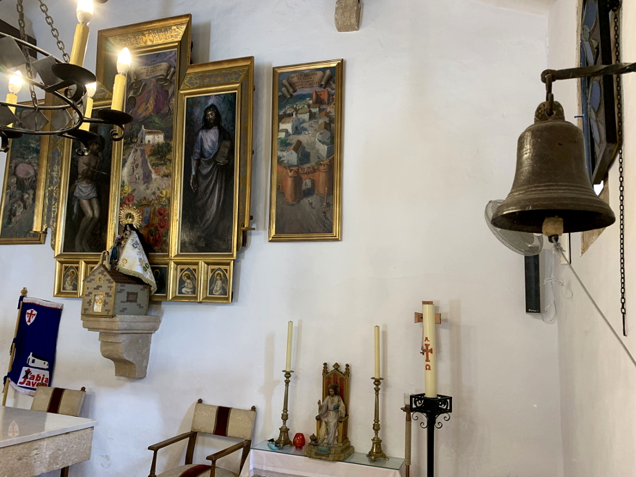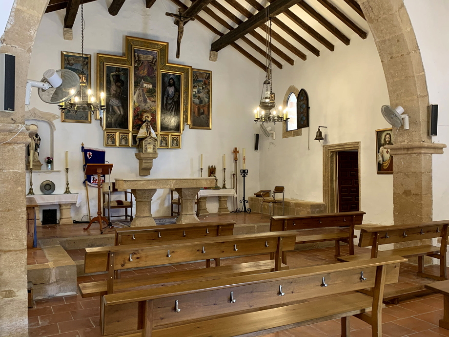 Tiene algunos tramos con banco de obra adosado al muro y, en el segundo tramo el presbiterio elevado un escalón; testero recto con retablo neogótico con pinturas alusivas a San Bartolomé y San Sebastián. Sobre una ménsula, imagen de la Virgen de Loreto sobre la casita, que en este caso sirve de Sagrario. A la izquierda una capilla de poca profundidad, con embocadura en arco de medio punto de piedra tosca, hoy alberga el coro, y a la derecha ventana alta con vidriera. A la derecha del primer tramo se ha abierto otro arco igual al anterior que accede a parte de la casa del ermitaño ampliando la nave. Todos estos adicionamientos desfiguran la estructura original…». (4)