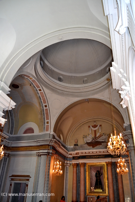 La planta, se ha dicho en cruz griega, pero en realidad es en forma de cruz latina. Tiene nave a los pies, con capillas entre los contrafuertes. Pilastras a la faz con capiteles corintios entablamento y arcos fajones, que soportan la bóveda de cañón. El crucero tiene la anchura de la nave más las capillas y se cubre con cúpula sobre tambor, pechinas y arcos torales. Todo el patrimonio mueble fue destruido en el verano de 1936…». (4)