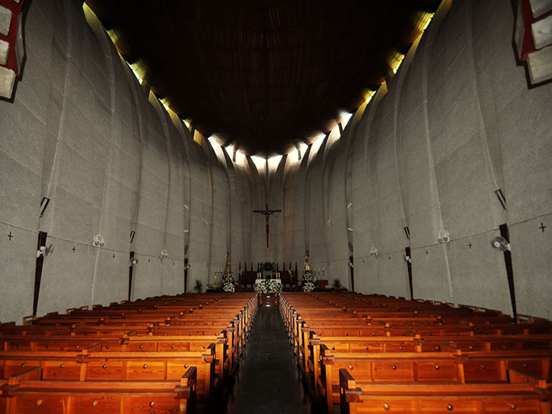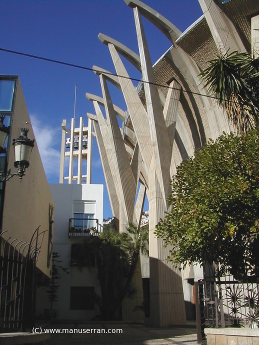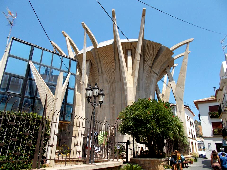 Construida en 1967 sobre el solar de una antigua iglesia (1), es un importante ejemplo de la arquitectura religiosa de vanguardia, obra de los arquitectos García Ordóñez, Dexeus Beatty, Bellot Port, Herrero Cuesta y el ingeniero Gómez Perreta. Destaca por el atrevido diseño de sus líneas y la concepción del espacio. Los materiales utilizados son el hormigón armado (cemento y hierro). Es de nave única de planta ovalada. Posee muros sin esquinas que se abren en la parte superior hacia el exterior en su parte superior, terminando en unos ventanucos por donde se recibe una luz cenital que da una ambiente de recogimiento y espiritualidad. Su cubierta de madera de pino rojo, en forma de quilla de barco, representa la barca del pescador. La ornamentación interior es escasa, destaca el gran Cristo suspendido sobre el altar mayor (de Esteve Edo). En el exterior los doce esbeltos tirantes que la sustentan son una alegoría a los doce apóstoles…». (2)