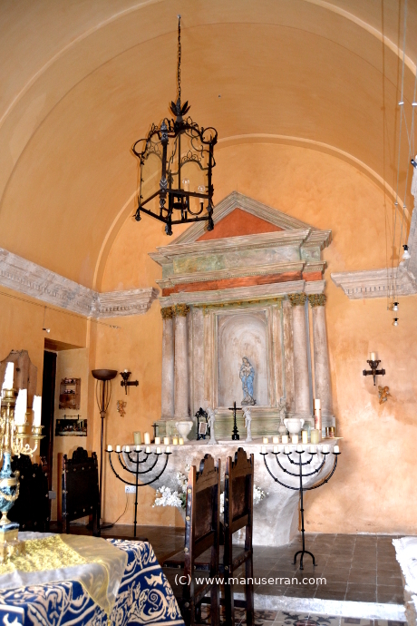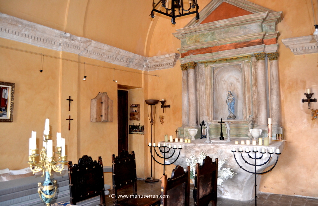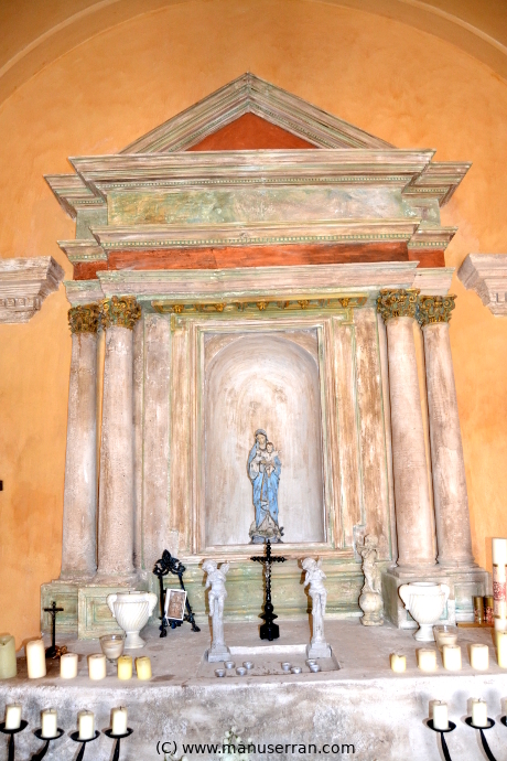 Al interior, decorado en los mismos tonos claros, encontramos solado de losetas cerámicas y bóveda de cañón con arcos fajones que arrancan de decorada cornisa y pilastras de poco relieve. En el presbiterio, que comunica por la izquierda con la vivienda, preside el recto testero altar y retablo de obra de estilo neoclásico con columnas que soportan entablamento y frontón triangular. En su hornacina se venera una pequeña imagen de la Virgen con el Niño…». (1)