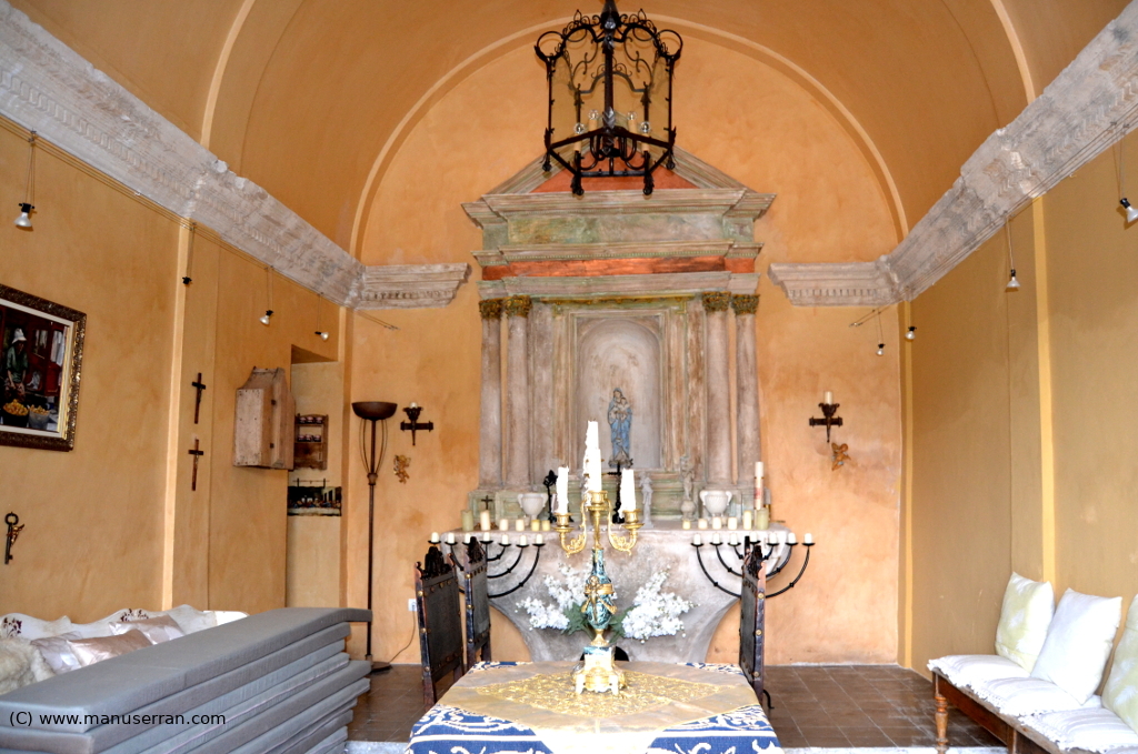 «…La propiedad constituye un compacto conjunto de dependencias donde el oratorio ocupa la esquina más meridional. Al igual que el resto de la finca, sus paredes están pintadas en color crema y parcialmente cubiertas por la hiedra y otra vegetación. Posee contrafuertes muy ataluzados en su lateral exento, al que vierte su tejado, y esquinas reforzadas por cadenas de sillares. En la fachada se abre puerta rectangular y óculo redondo por encima, rematando en cornisa curva mixtilínea que engloba en su centro un alargado seno de medio punto con pequeña campana.