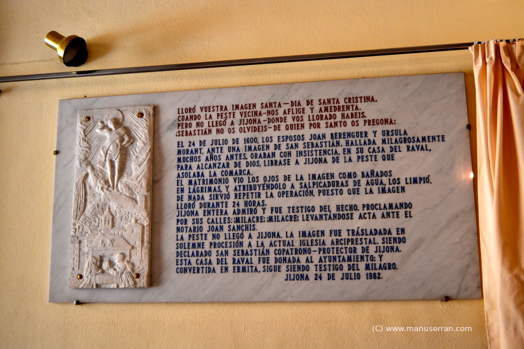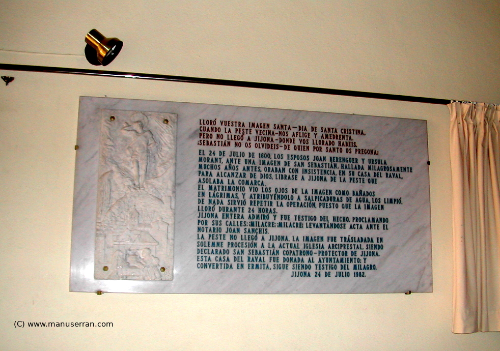 Los datos sobre su construcción se leen en un panel situado en el interior de la ermita: “El 24 de julio de 1600, los esposos Juan Berenguer y Úrsula Morant, ante la imagen de San Sebastián, hallada milagrosamente muchos años antes, oraban con insistencia, en su casa del raval, para alcanzar de Dios, que librase a Jijona de la peste que asolaba la comarca. El matrimonio vio los ojos de la imagen como bañados en lágrimas, y atribuyendo a salpicaduras de agua, los limpió. De nada sirvió repetir la operación, puesto que la imagen lloró durante 24 horas. Jijona entera admiró y fue testigo del hecho, proclamando por sus calles: !Milagro! !Milagro! Levantándose acta ante el notario Joan Sanchís. La peste no llegó a Jijona. La imagen fue trasladada en solemne procesión a la actual iglesia arciprestal, siendo declarado San Sebastián Copatrono Protector de Jijona. Esta casa del Raval, donada al Ayuntamiento y convertida en ermita, sigue siendo testigo del milagro.”.