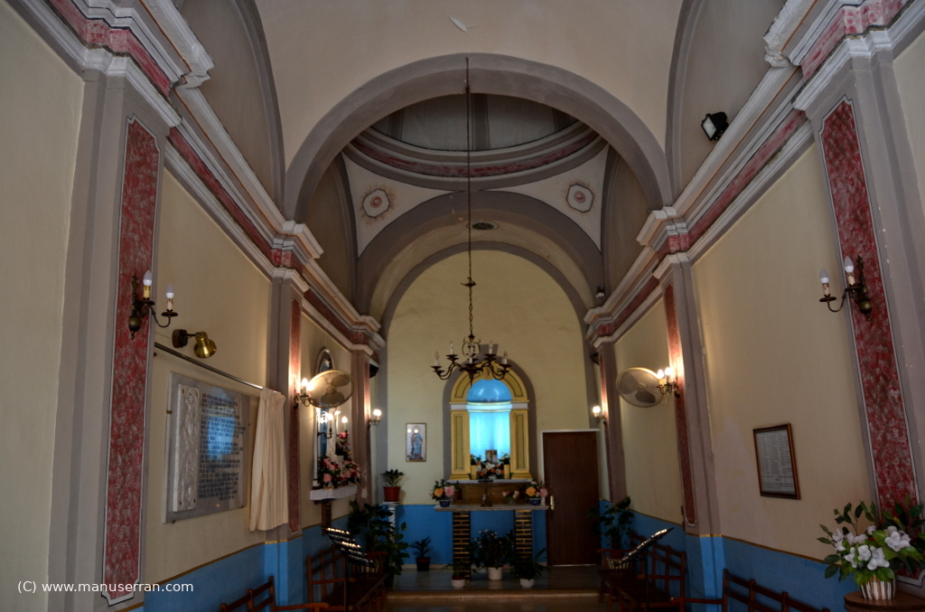 Consta de una nave que presenta tres pilastras resaltadas que señalan cuatro tramos, los dos primeros se cubren con bóvedas vaídas, el tercero con una cúpula de media naranja sobre anillo y pechinas, y el cuarto presbiterio, con bóveda de cañón; tiene el testero recto, una hornacina entre pilastras de planta circular, arco de medio punto sombre improntas y bóveda de horno, con la imagen de San Sebastián…». (3)