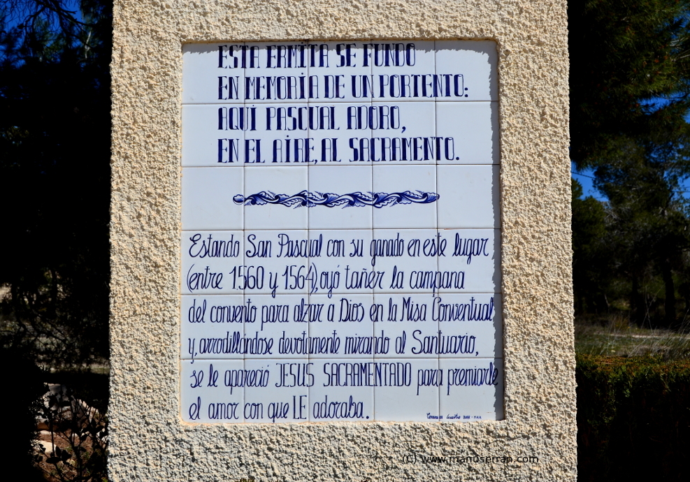 Según Montesinos (1): “…Fundada en el año 1689, con licencia del Ilmo Sr. Dn. Antonino Sanchez del Castellar, Obispo de Orihª. dedicada a San Pascual Baylón, en memoria de que estando el Santo, siendo Pastorcito, guardando su ganado de ovejas y carneros, en contemplaciones, todo absorto, elevado, y casi enagenado de sus sentidos, por haber oydo tocar la campana del predho. Convento al alzar a Dios en la Misa Mayor… se le apareciò en el ayre, todo circuido de Serafines, Arcangeles, y Angeles en precioso trono de magestad, hermosura, y grandeza, el Augustísimo y Soberano Eucaristico Sacramento…”. Dicho prodigio aconteció por el año 1563.