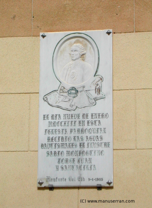Las primeras noticias que tenemos sobre Monforte datan de 1640 y Bendicho, nos refiere lo siguiente: «..Monforte, o Monpot, como se llama en la Historia de D. Jaime, antes fue más poblado que ahora, pues no llegan sus casas a 200. Pero siempre fueron de cristianos viejos. Está fundado en las laderas o faldas de un montesico no muy alto, pero se descuella y haze eminencia en toda su campiña y llanura, en la cual está fundada una buena fortaleza, guarnecida con sus muros, almenas y barbacanas, dentro de la cual está la Iglesia parroquial, que es un templo muy hermoso, de una sola nave, dedicado a la Asumpción de la Virgen Santisima, que debió de quedar su dedicación por la devoción del Inclito Rey D. Jaime primero. El altar mayor es de la historia de la Virgen Santísima, de muy valiente pintura. Es aqueste pueblo universidad, pero con limitada jurisdicción, pues no tiene en caso de crimen…». (1)