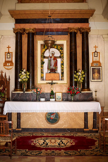 La puerta se rodea de fajones acanalados. Encima de ella una imposta con pináculos en los extremos, más arriba un tondo circular que aloja un reloj de sol. Por arriba del frontón, en los extremos, las esquinas se prolongan en cortos pilares rematados con pináculos; sobre el centro, la espadaña sigue el mismo estilo que la fachada. La planta, es de nave única rectangular con capillas entre los contrafuertes, mide 8,77 por 4,14 metros. Presenta pilastras que, sin mediar capitel, sostienen el entablamento y los arcos fajones; revestimiento de yeso con zócalo pintado imitación mármol. Presbiterio elevado un escalón, tiene retablo con cuatro columnas y hornacina con la imagen de San Blas…». (3)