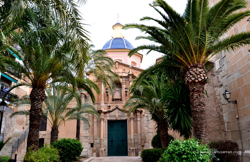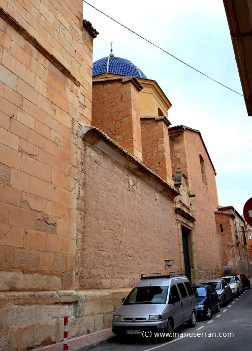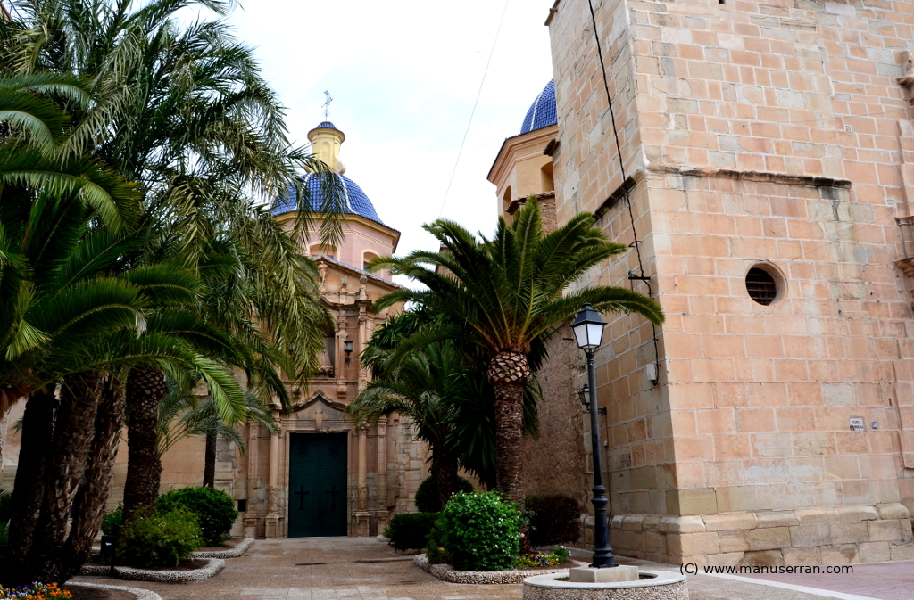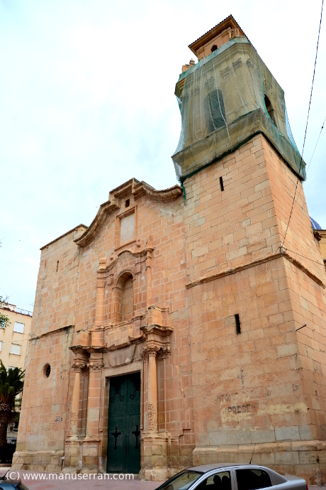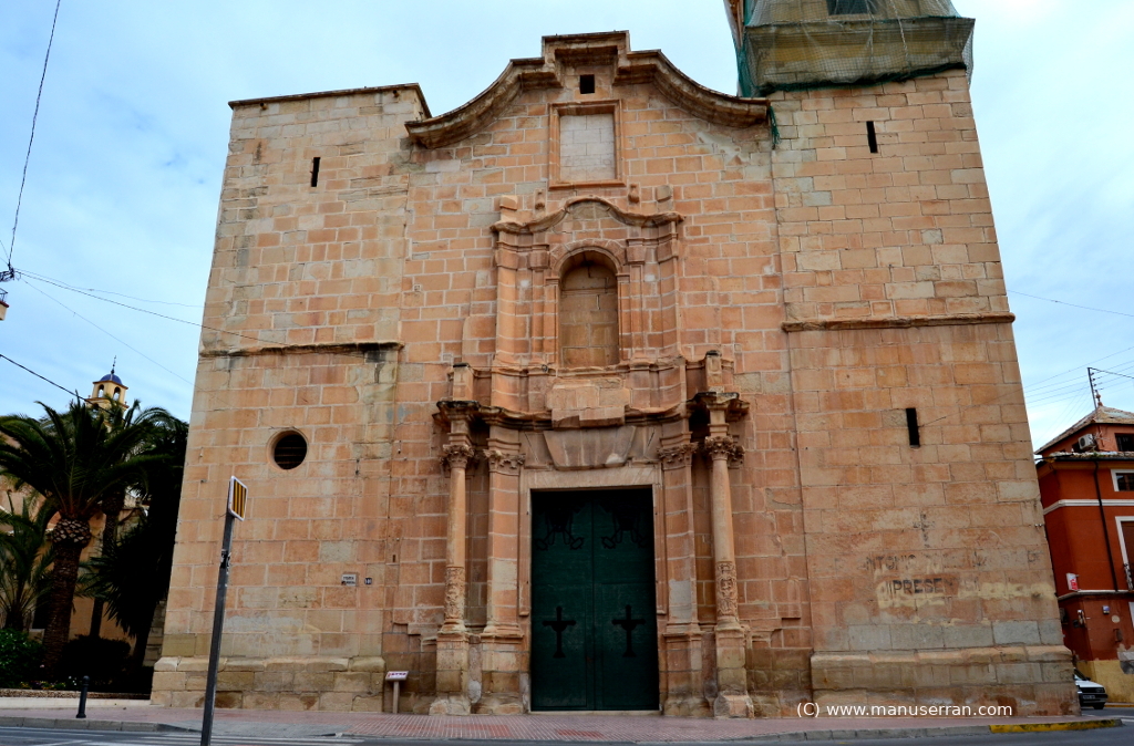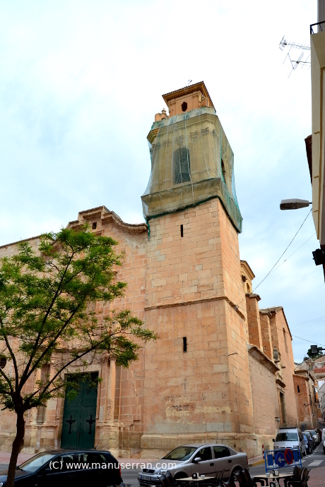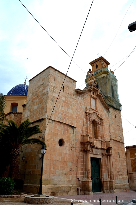«…Construida sobre una anterior de 1577 bajo la misma advocación, que fue derribada e iniciada la nueva construcción bajo la dirección de Vicente Insa en 1751. Hasta 1754 se realizó el transporte de materiales, el alzado de los muros con mampostería y de las esquinas, pilastras con sillería de cantería. A partir de 1755 comenzó la construcción de la bóveda y al año siguiente el trasaltar. A partir de ese año traen, desde Alicante, los púlpitos, balcones y el hierro de las puertas. En 1789, los arcos de la iglesia dan nuevos problemas y se cambian por arcos torales. En 1798 se construyó la torre para colocar las campanas. En 1801 se colocan las barandillas de la torre y en 1805 nuevas obras de estilo neoclásico del arquitecto Ramón Berenguer: Altar Mayor y un Tabernáculo. En 1812 se hizo el baptisterio y un año después la capilla de San Miguel. En 1814 se doró el crucero y se realizó el altar de San Antonio y el frontis del baptisterio. En 1815 se pintó el lienzo de San Juan Bautista. En 1816 siguen las obras con la Capilla de la Comunión. Puchol realiza la imagen de San Miguel. A partir de 1825 se realizan nuevas obras en los diferentes altares, así como la escalera en el trasagrario con balaustrada muy torneada que no se conserva. En 1848 se arreglan las puertas colocando la mampara de madera, forradas de hojalata años más tarde el escultor Antonio Ruidavets restaura la imagen de San Juan Bautista. La Capilla de la Virgen se comenzó a levantar en 1760. En 1765, bajo la obligación notarial, José Gomis se compromete a concluir la obra, Los exteriores se terminaros en 1766, pero la decoración interior se alargó hasta 1787-90. Realizó las pinturas Tomás Belando y lo más importante de la parte artística Francisco Mira y Ochoa, quien labró el nuevo retablo, de elevada riqueza y símbolo más significativo del arte barroco en la decoración interior del templo. En 1787 se realiza la talla de las pechinas. En 1788 se abrieron las dos ventanas que dan al jardín de la iglesia: la del trascamarín y la del Archivo que era la sacristía de la capilla. La cúpula de la capilla se pintó en 1789. En 1831 y hasta 1835 se labran las pilastras de la Capilla hasta la altura de un hombre y se doran…». (1)