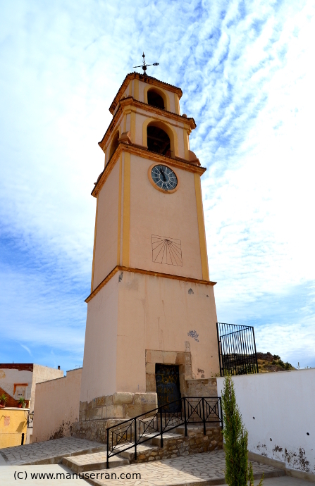 Aunque la iglesia tiene dos campanarios, uno de ellos sin concluir, la Torre del Reloj se halla separada del edificio en lo alto de una pequeña colina que se eleva en medio de la población: se edificó en 1735, es de mampostería, su figura cuadrada y de 80 palmos de elevacion, con una sola campana…». (2)
