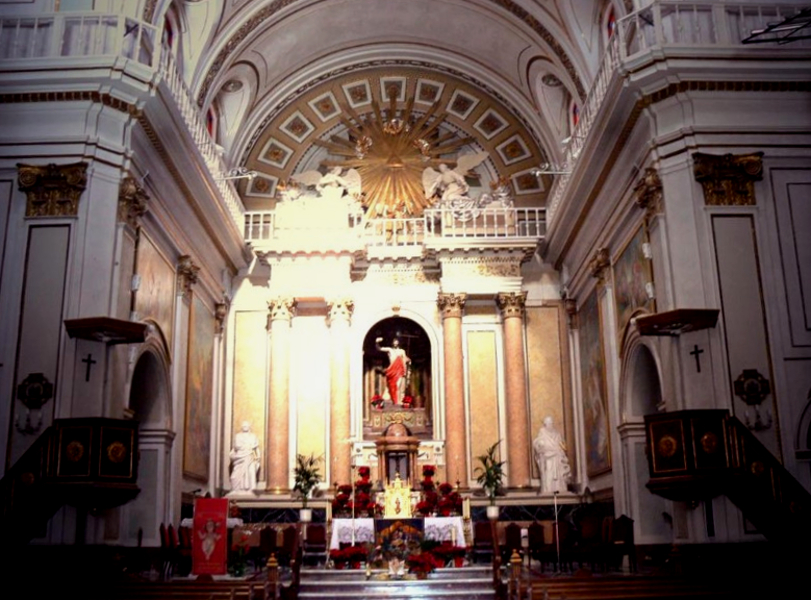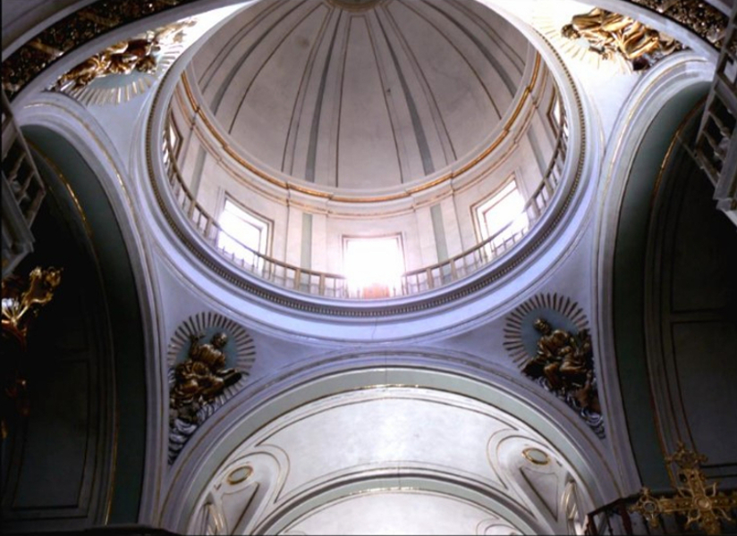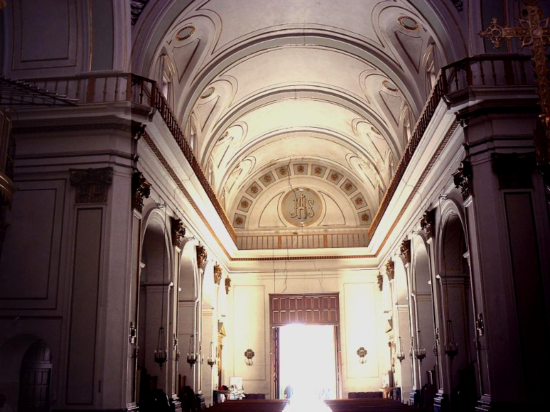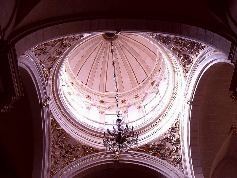 La nave de la iglesia tiene 204 palmos de longitud, 84 de latitud, y 44 de elevacion hasta la cornisa, llegando á 74 hasta la bóveda, y 130 hasta la media naranja, que es de medio punto; se halla sostenida por diez pilastras cuadradas de canteria que rematan con capiteles del órden compuesto, y comprende cuatro altares por lado, y á la cabeza detras del mayor, cerrado con una verja de hierro, está el coro, cuya silleria es de nogal con algunos embutidos de diferentes maderas, asi como el tabernáculo de piedra jaspe sostenida por ocho columnas de la misma piedra. En el crucero al pie de la cornisa de la media naranja y en los cuatro ángulos de sus arcadas se ven los cuatro evangelistas tallados en la misma piedra; y bajo de dicha media naranja el órgano, que segun opinion de los inteligentes es muy bueno, y su caja de madera trabajada con bastante gusto; la sacristia es muy espaciosa y tiene un pequeño surtidor que da entrada al coro. En 28 de mayo de 1760 se ensanchó la iglesia con la construcion de una hermosa capilla toda de silleria, que forma un perfecto cuadrado con cinco altares, y al lado de esta en su parte interior se construyó otra llamada de la Comunión, vaciando por medio del barreno y del pico una mole de piedra.