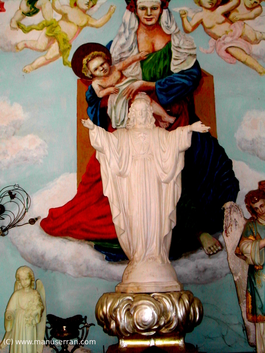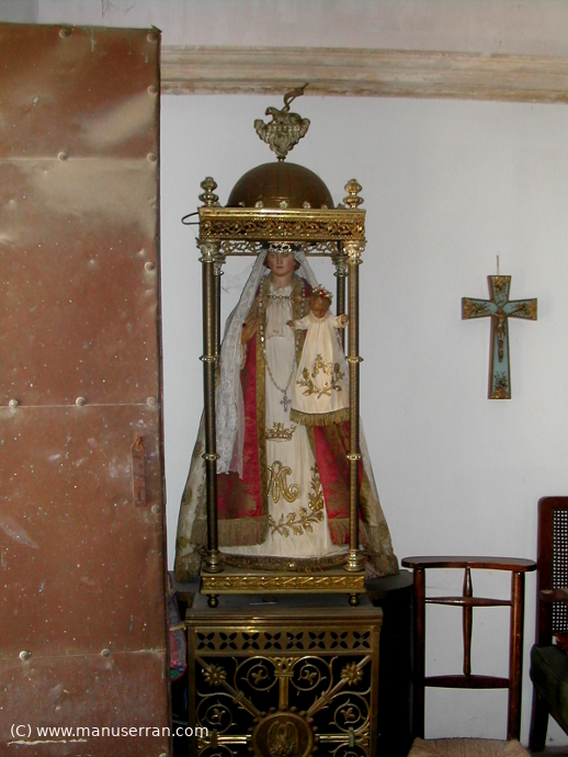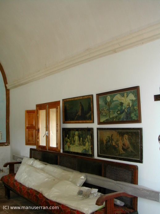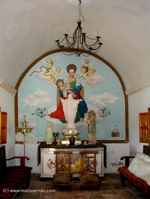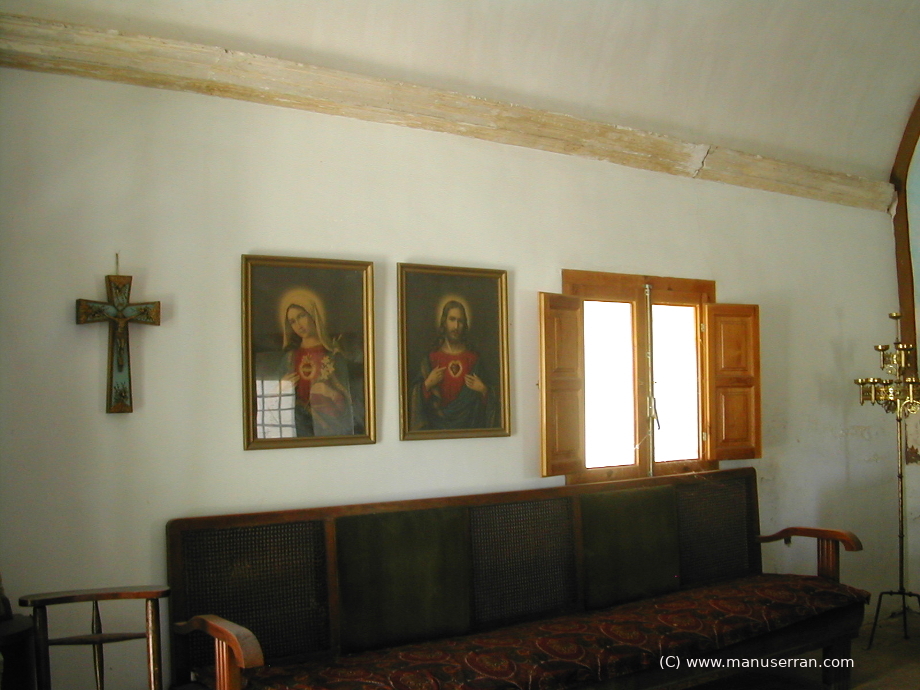 El interior tiene bóveda de cañón y dos bancos de madera a cada lado, sacristía y un pequeño confesionario…». (2)