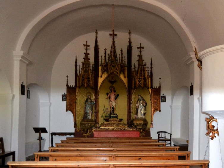 La planta es de nave única rectangular, dos pares de pilastras con capitel dórico y arcos fajones dividen la nave en tres tramos; a los lados, cierran los espacios entre las pilastras arcos de medio punto sobre impostas, simulando la entrada a capillas ciegas. Cubre la nave una bóveda de cañón de generatriz de arco rebajado. A la derecha, sobre la primera pilastra púlpito de obra. A la cabecera recta se adosa retablo neogótico con tres imágenes, en el centro San Sebastián y a los lados San Roque y San Antonio Abad, que forman la trilogía medieval contra las enfermedades pestilentes. Las paredes enlucidas en blanco y el piso de losas de barro rojo.