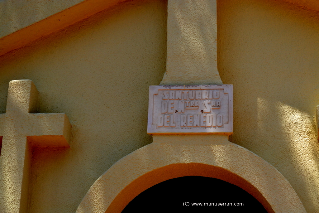 Rodeada de fincas de segunda vivienda y de tupida arboleda, resulta casi impenetrable. Edificio en forma de prisma pentagonal y tejado a dos aguas de teja plana. La fachada sólo se ve parcialmente pues un porche muy amplio se adosa a la misma; el porche esta formado por pilares y arcos escarzanos sobre los que apoya el tejado. Se autodenomina Santuario de Ntra. Sra. del Remedio en una lápida puesta sobre la entrada del pórtico. La fachada es lisa con puerta dintelada, sobre ella una ventana semicircular y se remata con perfil escalonado sobre el que apoya la espadaña.