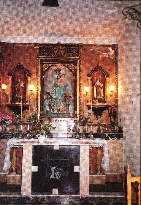 La planta es rectangular. En la cabecera, ocupa todo el fondo un altar con retablo rodeado de moldura dorada; tiene en el centro una hornacina en arco de medio punto entre columnas de fuste liso y friso con el anagrama mariano que contiene la imagen de Nuestra Señora del Remedio. Otras dos hornacinas sobre peana, columnas estriadas y arco de medio punto, una a cada lado de la anterior, contienen imágenes de bulto de Santa Teresa y San Antonio…». (1)