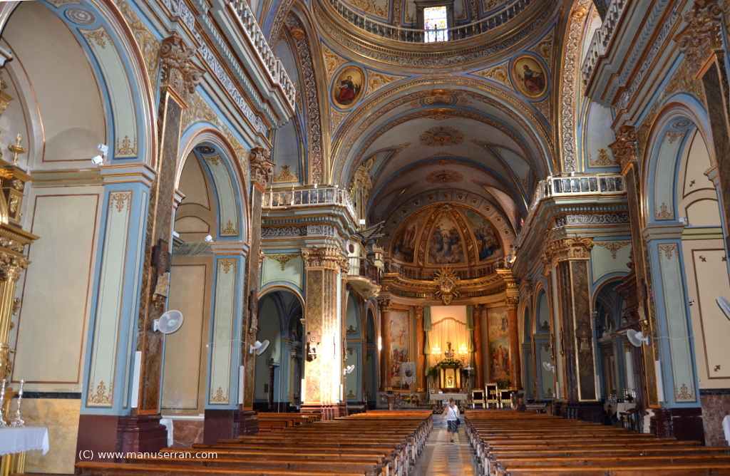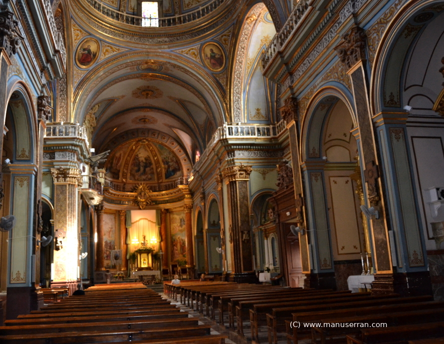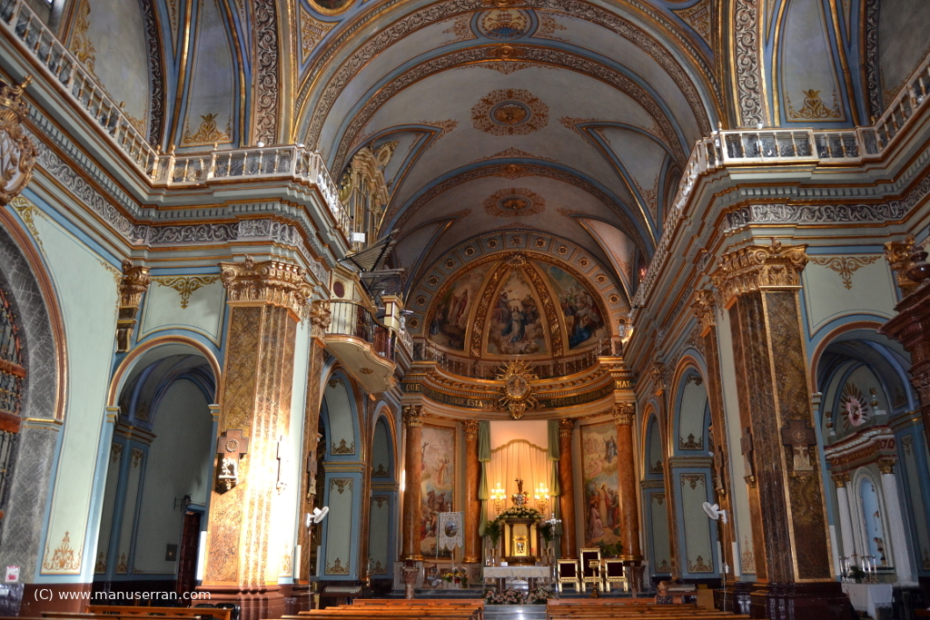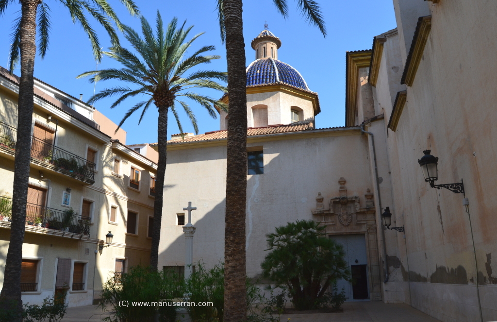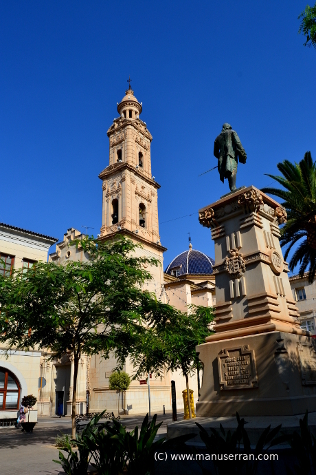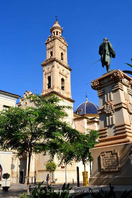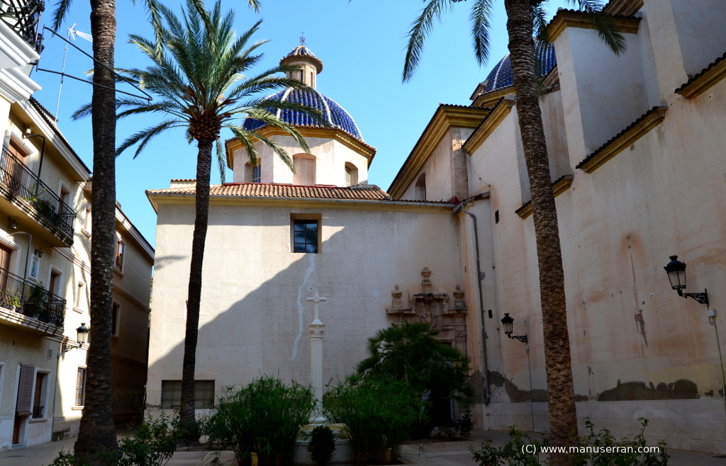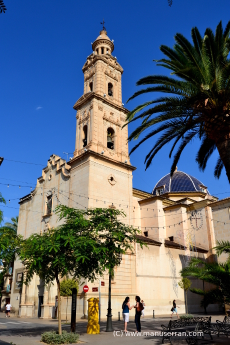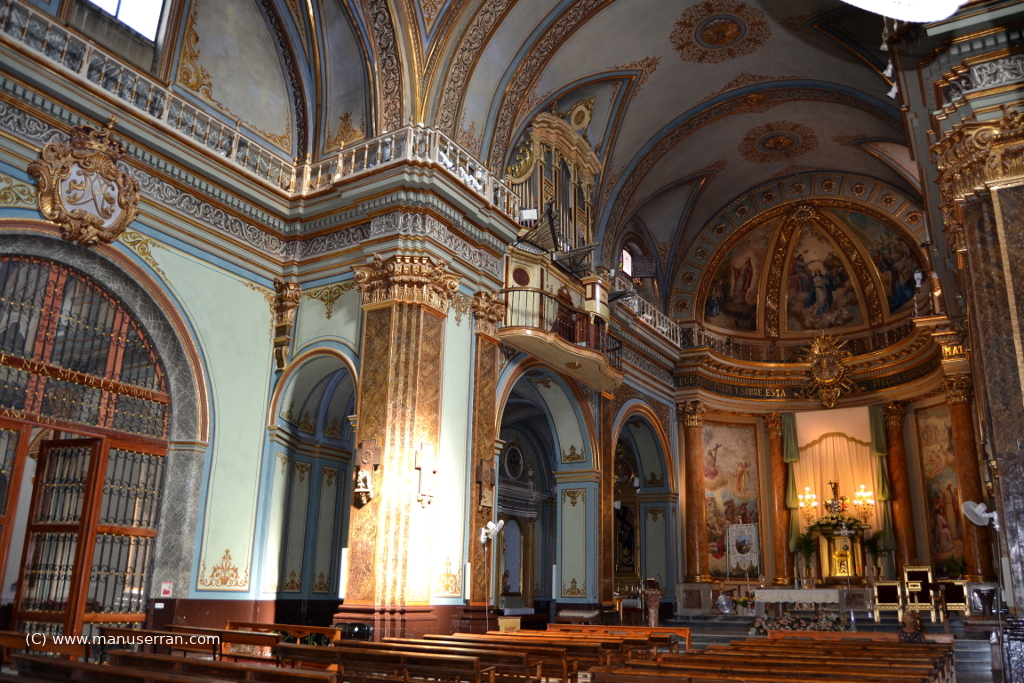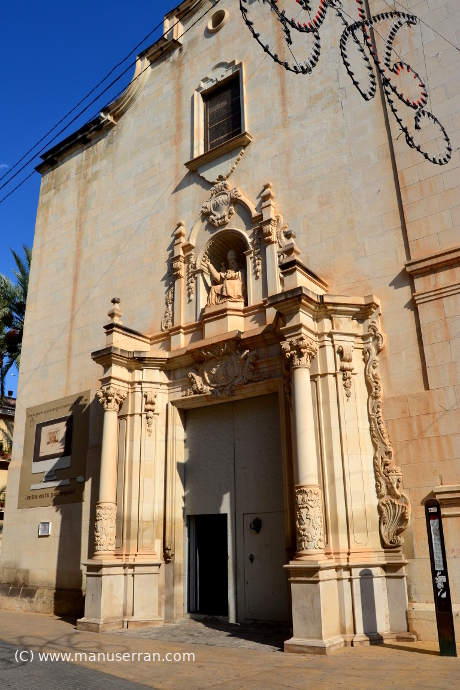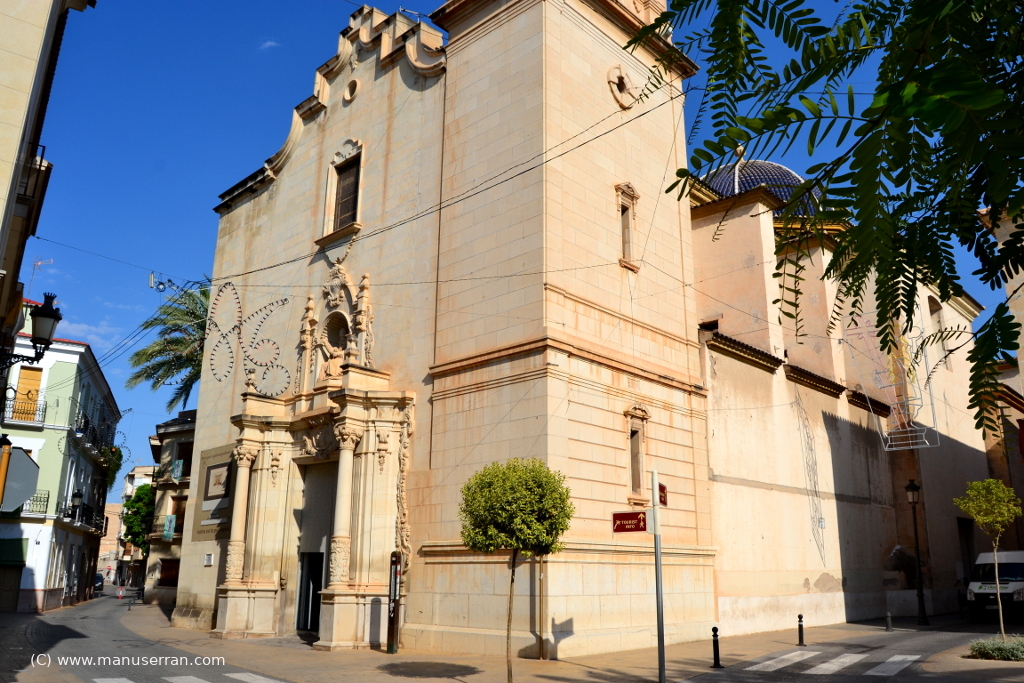 «…Iniciada su construcción en 1553, se trata de un templo con planta de cruz latina y nave de tres tramos con capillas entre los contrafuertes, crucero con brazos cortos y cúpula sin tambor (con ventanas abiertas sobre la misma cúpula); el presbiterio es profundo y tiene también naves laterales. El interior, oscuro y abigarrado, está ornamentado con grutescos bicolores y dorados. Destaca el retablo principal con el santo titular, sin camarín. La nave y el presbiterio se cubren mediante bóveda de cañón con lunetos, disponiéndose el coro a los pies sobre pilares cuadrados, pilastras corintias entre las capillas y balcón corrido superior. En el crucero de la iglesia, siguiendo su eje transversal, como un edificio anexo, se abre la capilla de la Comunión, dedicada a la Virgen de la Aurora, con cúpula sobre tambor, pechinas y cupulino y planta de cruz casi griega. En el exterior hay dos portadas de piedra: la del imafronte de la iglesia y la de la capilla de la Comunión, recayente a una pequeña plaza con palmeras. El campanario muy esbelto, destaca por su elegancia y sutilidad, en una curiosa y lograda superposición de elementos volumétricos y ornamentales barrocos y modernistas…». (3)