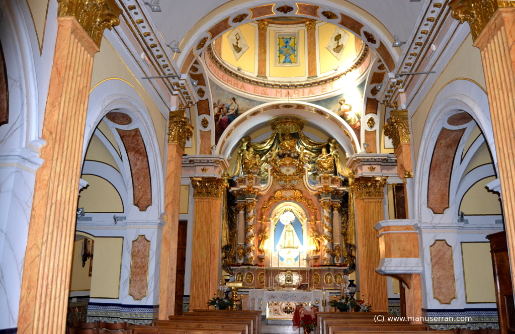 A la izquierda está la sacristía y a la derecha una cámara con ex-votos devocionales. Tiene trasaltar. Revestimiento de mortero de cemento y pintura, pavimento de losetas de mármol de colores, formando figuras geométricas; presbiterio de mármol negro. Pinturas en las pechinas de prefiguras bíblicas de la Virgen María: Rebeca, Ruth, Ester y Judit.