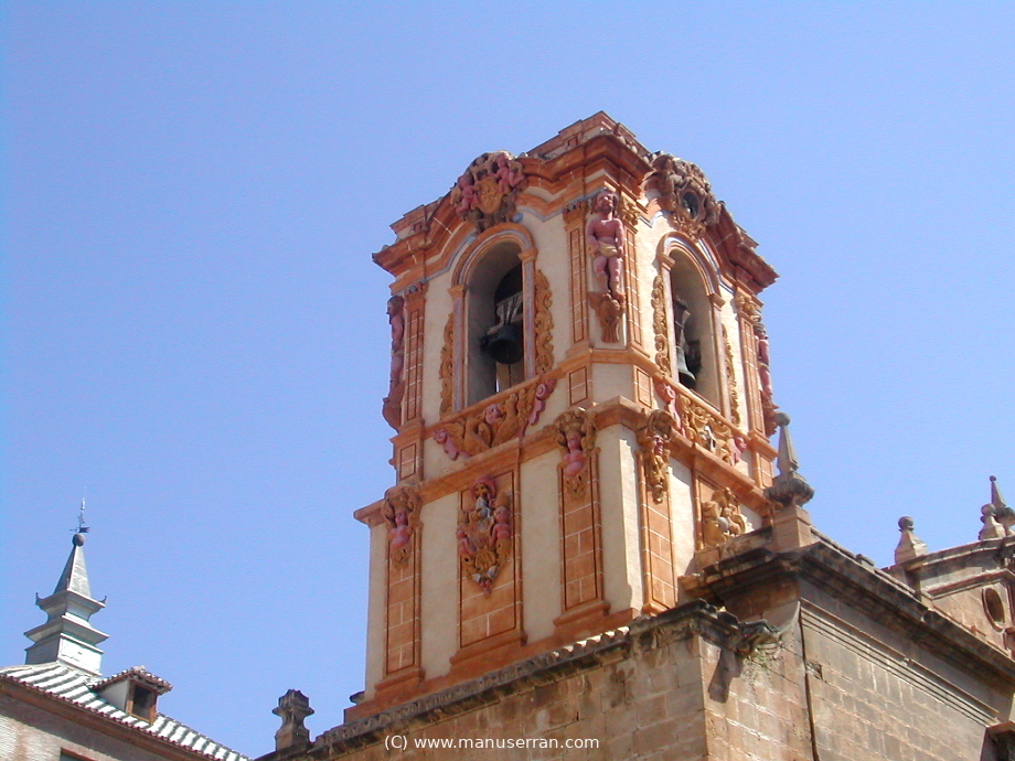 La torre, de estilo barroco, realizada entre 1738 y 1739 en ladrillo tallado, revocado y pintado.