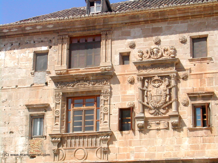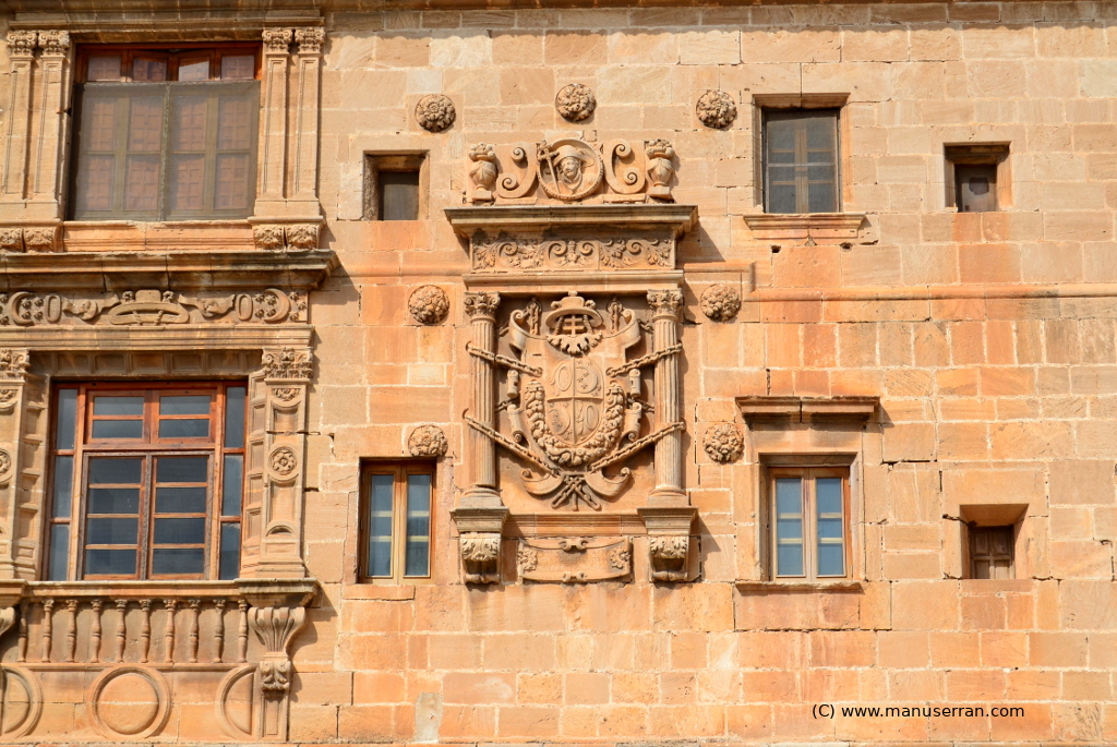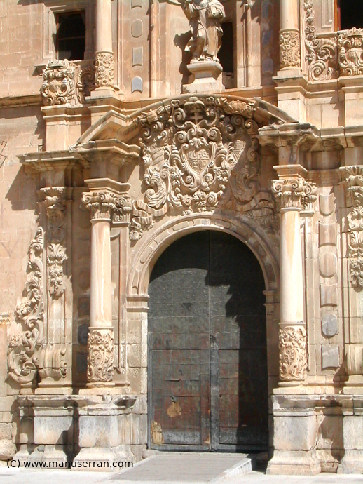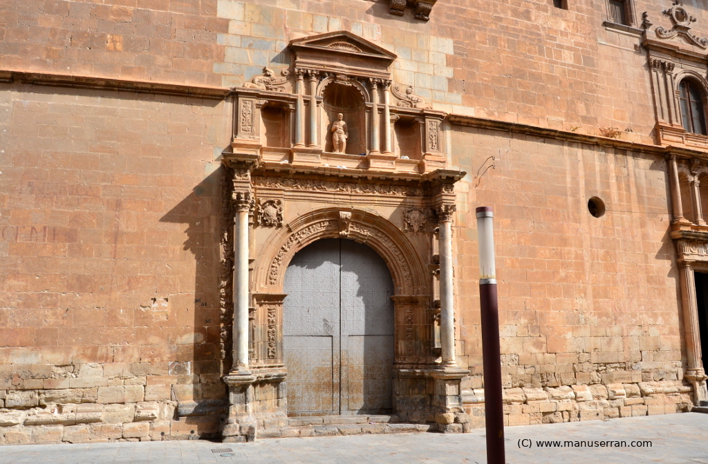 Visita al exterior: El Convento-Colegio fue proyectado en 1553 por Jerónimo Quijano, participan en su construcción Juan Inglés desde 1553 hasta su fallecimiento en 1563 y Agustín Bernardino a partir de 1602. El edificio sufrió importantes transformaciones en la primera mitad del siglo XVIII, es un claro ejemplo de la síntesis del Renacimiento, Manierismo y Barroco. El monumento se caracteriza principalmente por sus grandes dimensiones y marcada horizontalidad de fachadas, acentuada por las molduras de su zona inferior, las molduras de separación entre plantas y las cornisas, horizontalidad truncada en las tres portadas y algunas ventanas profusamente decoradas.