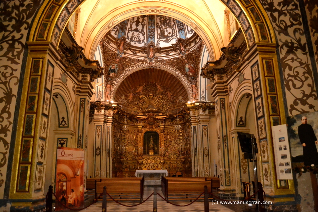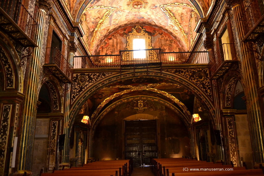 La iglesia se halla colocada á la parte del edificio que confina con la primera casa de la ciudad; es bastante capaz y de primorosa arquitectura: ademas de los cuatro arcos torales tiene en la nave otros cinco de medio punto, y todos sostenidos por columnas de orden corintio acanaladas y doradas sus cornisas. La cúpula y bóvedas estan pintadas al fresco, con hermosas imágenes y otras figuras que se conservan muy bien tratadas: el cascaron de la capilla mayor forma una pechina dorada muy vistosa. Tiene un buen órgano y dos coros, uno en alto y otro en el presbiterio; dentro de este y á la derecha del altar mayor hay un sepulcro de mármol adornado con escudos de armas é inscripciones, y sobre él, el busto del Patriarca fundador también de mármol, vestido de pontifical: el cadáver de dicho señor está en un panteón á la derecha, tambien del altar mayor, bajo una puerta chapada de hierro. La sacristía es proporcionada á la suntuosidad de la iglesia y colegio. En el dia está habilitada esta iglesia como ayuda de parroquia para la celebracion de misas. Las rentas de este colegio eran muy pingües; distribuía una sopa muy decente á los estudiantes pobres y otra separada á los mendigos, y contenia dentro de sus muros un espacioso huerto, regado por dos norias, con otros pequeños jardines que situados al pie de la montaña, presentaban una vista deliciosa…». (1)