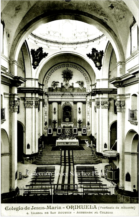 Madoz, cuando se refiere a los conventos de frailes en Orihuela, encabeza la descripción de los mismos con el de San Agustín y dice: «…El de San Agustin es sin duda el mas antiguo de la ciudad, y sus religiosos ocupaban el primer lugar en las procesiones generales: no consta su fundacion, pero si que en 1452 fue convocado su prior y concurrió á un consejo general de ciudadanos, celebrado para tratar de la separacion del obispado de Orihuela del de Cartagena. Está situado en el arrabal y calle de su nombre, á la salida por esta ciudad: á principios de este siglo emprendieron los frailes su reparacion general, pero habiendo tomado un rumbo demasiado costoso y sobreviniendo la guerra de la Independencia, quedó solo hecha la frontera principal hasta el segundo piso, sin haberla podido continuar; lo restante del edificio está muy ruinoso é inhabitable. La iglesia es obra de fines del siglo anterior, muy capaz, con dos torres de silleria; pero de resultas del terremoto de 1829 fue preciso demoler la una y rebajar la otra: se conserva como ayuda de parroquia de Sta. Justa para la celebracion de misas…». (1)