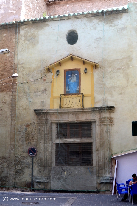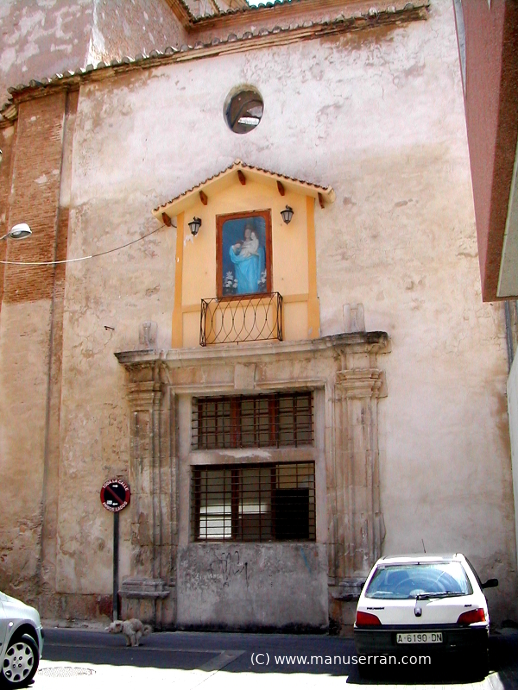 Madoz, cuando se refiere a los conventos de frailes en Orihuela, encabeza la descripción de los mismos con el de San Agustín y dice: «…El de San Agustin es sin duda el mas antiguo de la ciudad, y sus religiosos ocupaban el primer lugar en las procesiones generales: no consta su fundacion, pero si que en 1452 fue convocado su prior y concurrió á un consejo general de ciudadanos, celebrado para tratar de la separacion del obispado de Orihuela del de Cartagena. Está situado en el arrabal y calle de su nombre, á la salida por esta ciudad: á principios de este siglo emprendieron los frailes su reparacion general, pero habiendo tomado un rumbo demasiado costoso y sobreviniendo la guerra de la Independencia, quedó solo hecha la frontera principal hasta el segundo piso, sin haberla podido continuar; lo restante del edificio está muy ruinoso é inhabitable. La iglesia es obra de fines del siglo anterior, muy capaz, con dos torres de silleria; pero de resultas del terremoto de 1829 fue preciso demoler la una y rebajar la otra: se conserva como ayuda de parroquia de Sta. Justa para la celebracion de misas…». (1)