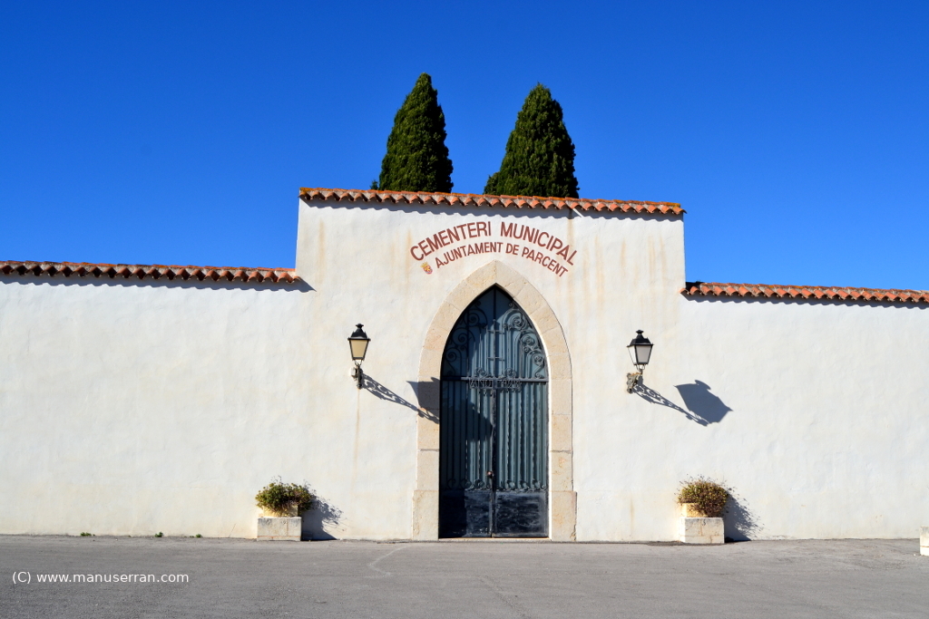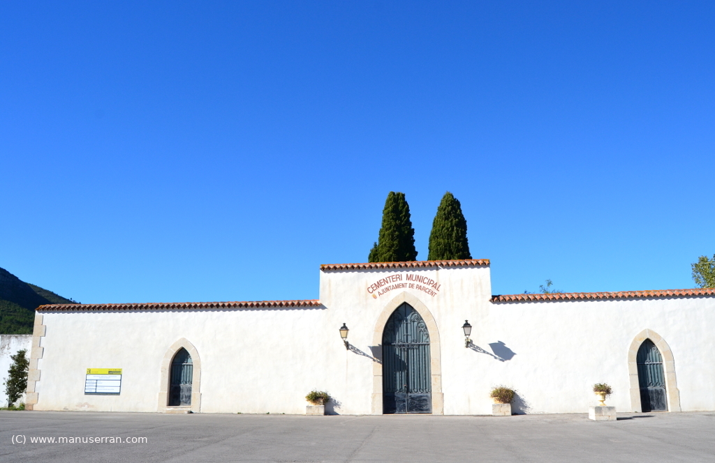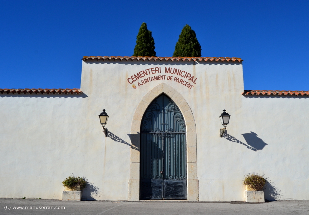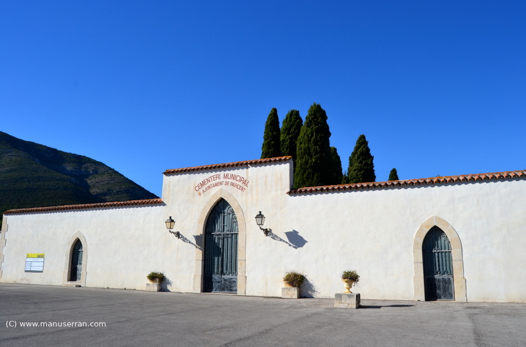 En la fachada pintada de color crema existen tres huecos recercados con forma de arco ojival. Todos ellos provistos de cerramientos de rejería. En el central, que se corresponde con el acceso principal, destaca en la parte superior la leyenda “Cementeri Municipal”. “Ajuntament de Parcent”. Y en la puerta, como decimos de rejería, “Año 1923”.
