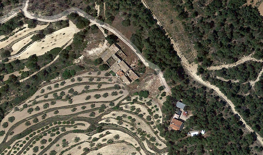 Visitado el lugar, los habituales carteles de Propiedad privada, Prohibido pasar y cancelas, nos impiden aproximarnos. Guiándonos de vistas aéreas, observamos dos masías: Mas de la Roqueta de d’Alt y Mas de la Roqueta de Baix. La calidad y el detalle de la imágenes no permiten apreciar edificaciones que se correspondan con alguna ermita o capilla.