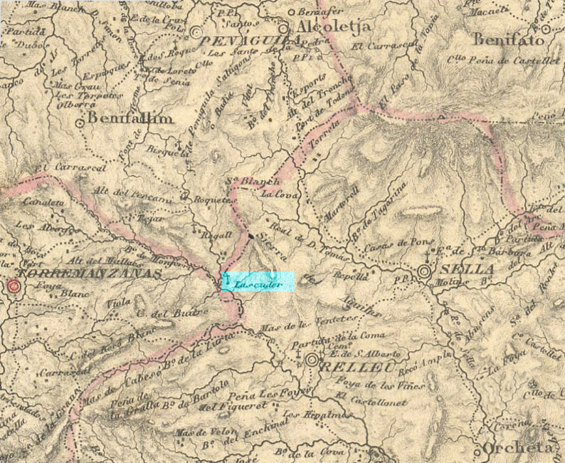 Por otro lado, en el mapa de la provincia de Alicante elaborado en 1859 por Francisco Coello, en las proximidades del lugar donde se encontraba la ermita de la partida Escuders, se hace referencia a una capilla o ermita denominada Lascuder que pensamos podría tratarse de la misma.