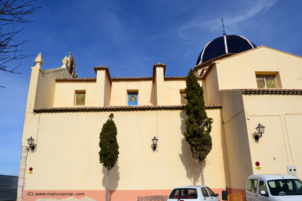 La fachada principal es pentagonal, de perfil superior triangular que se ve truncado por el apoyo de la espadaña la cual alberga una campana denominada Bonifacio, que fue bendecida hacia el 30 de septiembre de 1640. A su vez queda rematada por una moldura y dos pináculos piramidales a los extremos de la fachada. Además del vano de la puerta, en el centro de la fachada se abre un óculo de cristal por donde incide la luz que ilumina el interior de la ermita, que se ve reforzada por la ventanas laterales, donde quedan representados los escudos de las comparsas, lo que sirve además para darle un aspecto decorativo. Ya que como se puede contemplar predomina la austeridad y, casi me atrevería a decir, frialdad en sus elementos decorativos.