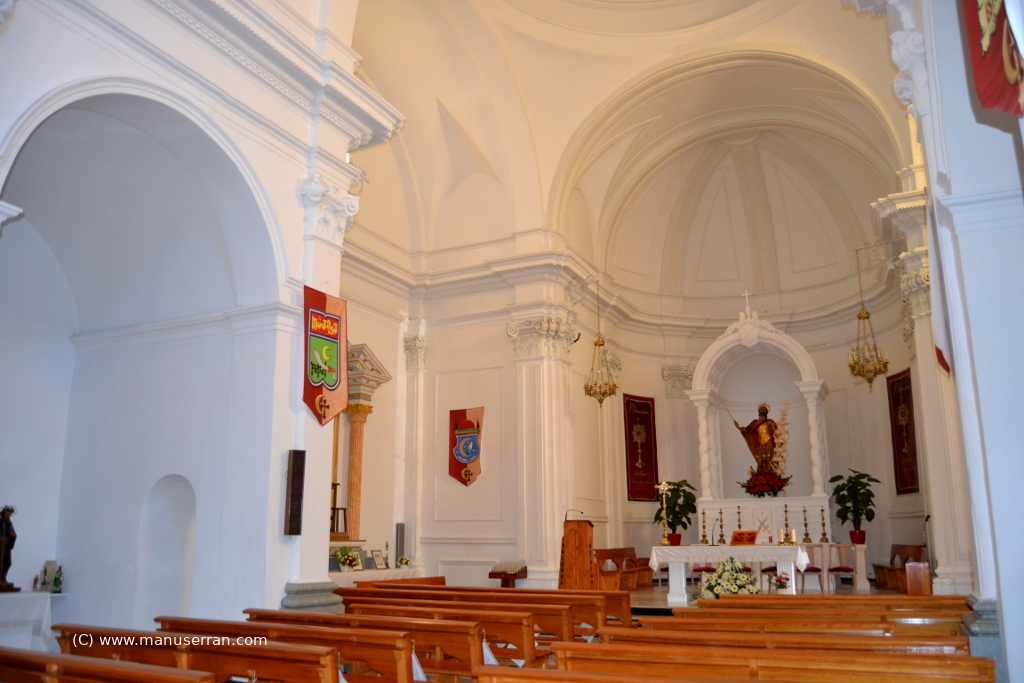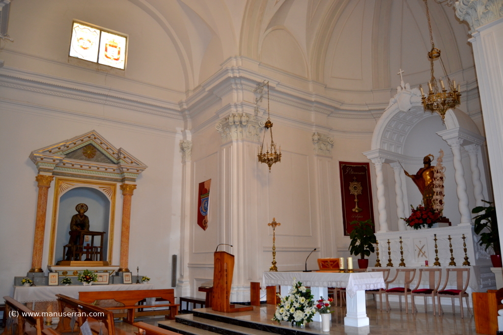 Si nos detenemos a detallar la ermita como monumento arquitectónico dejando atrás el contexto histórico que la envuelve, vemos que nos hallamos ante un edificio de planta rectangular dispuesta en cruz latina, que cuenta con una nave central que a su vez queda separada de las capillas laterales por tres pilares a cada lado y arcos fajones que conforman el conjunto separando en cuatro tramos el interior. Cabe señalar que en dichas capillas laterales, es donde se custodian y veneran las diversas imágenes del santoral católico (4). Además, se divisa en la parte superior una cornisa que recorre todo el perímetro la cual se apoya en la bóveda de cañón formando así lucernarios con los muros.