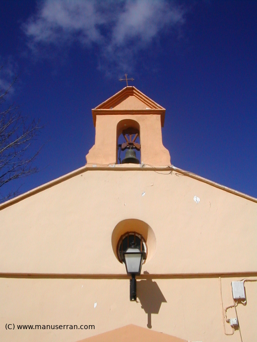 La ermita tiene algo singular, destaca en la lejanía como una vela blanca en un mar de viñedos. Pero es la traza de su fachada ensanchada hacia la base por la fusión con los contrafuertes, la que le da carácter. Orientada a mediodía, sobre la puerta de color vino, sin adornos, un óculo con vidriera marca el centro del frontón, y, sobre éste la espadaña de tabicón, culminada por un frontoncito triangular y cruz de hierro.
