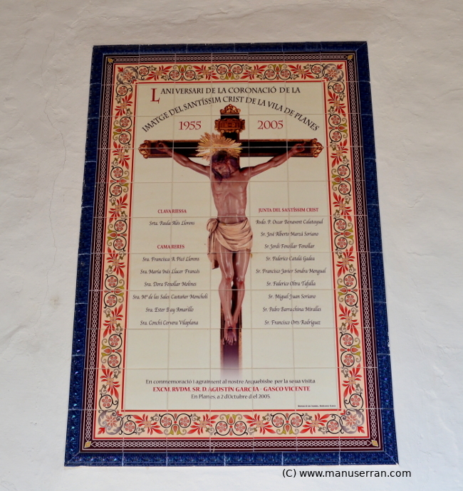 Aunque Sanchis y Sivera (2) da como fecha del cambio de advocación de San Cristóbal por la de Santísimo Cristo de San Cristóbal el año 1749, hay razones para pensar que pudo ser antes, entre 1742 y 1744, pues según Domínguez Moltó (3) en el Archivo Parroquial de Planes existe un manuscrito, personalmente sólo hemos visto una copia mecanografiada, en el que se narra la venida del Cristo a Planes y la intervención en este última fecha para aliviar a la población de una epidemia.