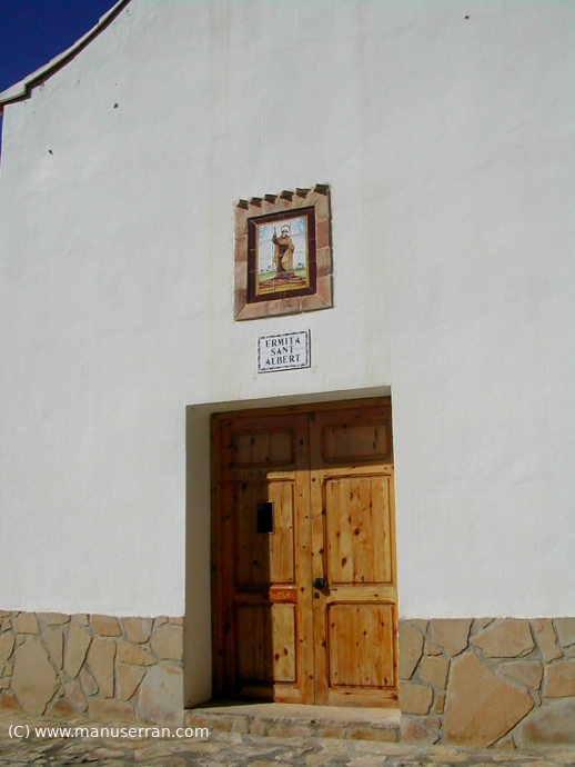 La ermita destaca bellamente por su estuco blanco, del azul del cielo. Se trata de un edificio exento, fabricado con mampostería revocada en blanco; zócalo a incertum (3); no tiene acera a su rededor. Tejado a dos aguas de teja curva. En los paramentos laterales se hacen presentes cuatro contrafuertes, absorbidos en la parte inferior. La fachada, orientada a levante, es poligonal; hastial con remate salva-aguas de varias curvas y coronado por una espadaña de tabique y arco de medio punto que aloja una mediana campana. Puerta de madera sin cubrimiento, tiene un pequeño ventano para ver al Santo. Sobre ella el rótulo: Ermita de San Alberto. La planta es de nave única rectangular, mide 11,25 por 5 metros. Se divide en cinco tramos por cuatro pares de pilastras adosadas; a cada una de ellas corresponde un contrafuerte, uniéndose entre ellas en sentido longitudinal por arcos formeros de medio punto, forman capillas de escasa profundidad. Recorre el perímetro de la nave una cornisa de cinco molduras, una de ellas gallonada, siendo arranque de los arcos fajones de tipo carpanel, en los que se apoya la bóveda. El presbiterio se eleva un escalón y sobre simple peana se apoya la hornacina que aloja a San Alberto; la hornacina se adorna lateralmente por contrafuertes espiroideos, que incluyen sendos ángeles; sobre el arco de la hornacina, hay un adorno igualmente barroco; todos ellos están realizados con escayola estucada en blanco y oro…». (4)