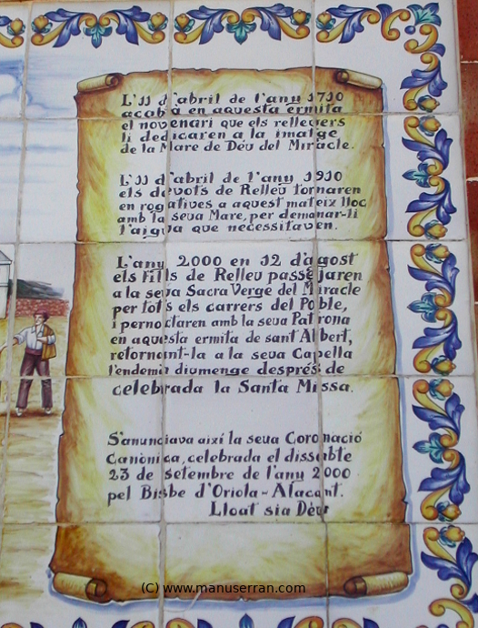 Se sabe por un manuscrito citado por Sendra Barbe (2) como llega a Relleu la devoción a San Alberto. Al parecer la villa estaba afligida por una epidemia de calenturas malignas por lo que decidió elegir por saculación un patrón, resultando elegido San Alberto, papeleta que había sido introducida en el saco por el reverendo Fray Hilario Lucas, Prior del convento de Nuestra Señora del Carmen de Alicante, que se encontraba circunstancialmente en la villa. San Alberto fue nombrado patrón de este villa, con voto de guardar por calendo su día y festejarle anualmente. No se sabe cuando fue construida la ermita; Fray Agustín Arqués Jover, en su Breve Historia de la Virgen del Milagro, dice que para 1710 la ermita de San Alberto ya estaba construida. Ante una pertinaz sequía, el Rector de la Parroquia de Relleu, natural de Cocentaina, porfió ante los feligreses en llevar una imagen de la Virgen del Milagro, patrona de su pueblo, en procesión rogativa a la ermita de San Alberto, del castillo, donde estuviese nueve días.