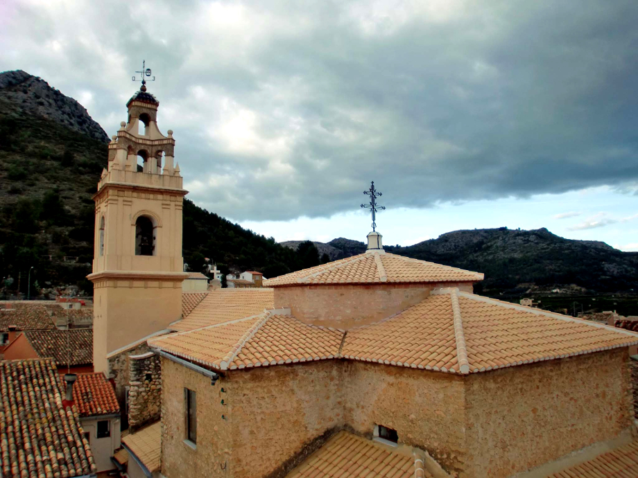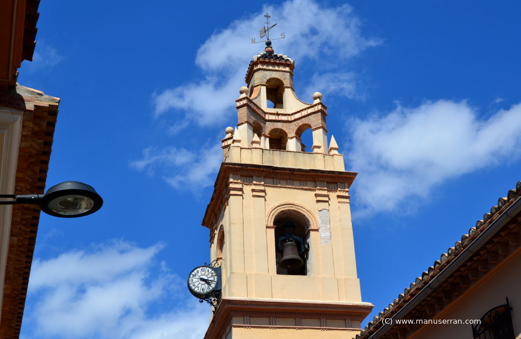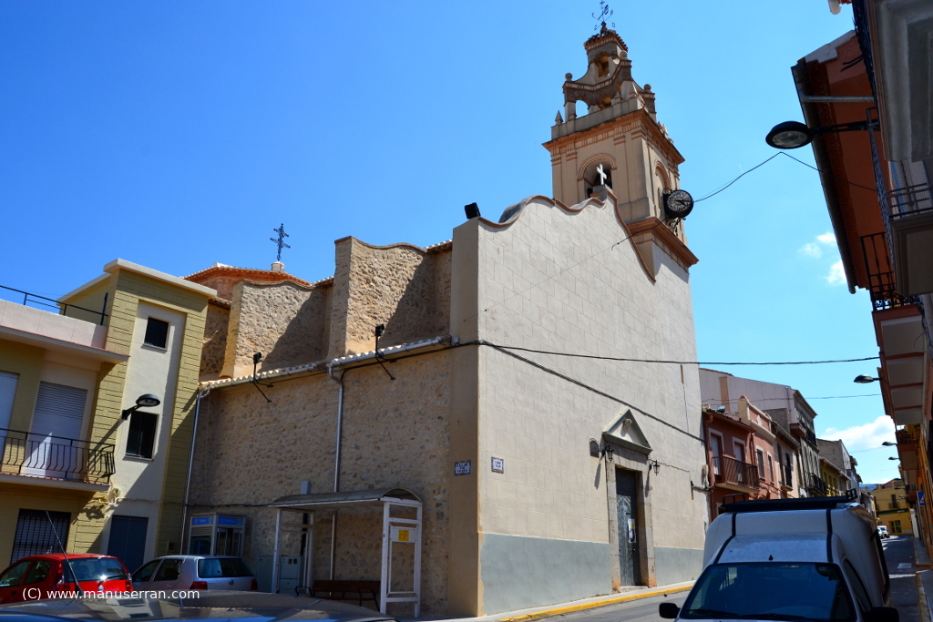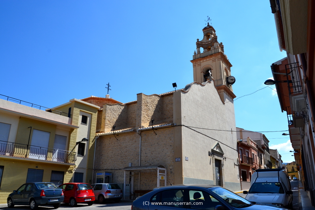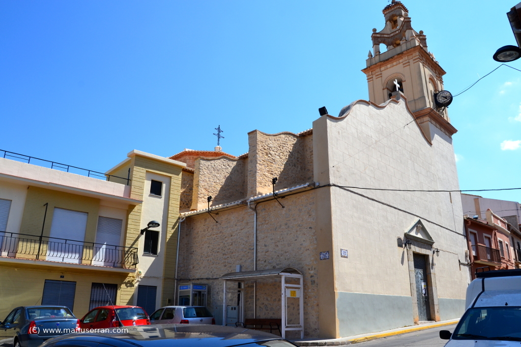 CAMPANARIO: Construido desde 1810 hasta 1858 por el maestro Francesc Oltra sufrió una fuerte reforma en 1997 al cambiarse el remate original por uno moderno a imitación de los tradicionales barrocos valencianos. Se erige como símbolo de la villa junto al característico reloj, único de este tipo en campanarios por la disposición perpendicular a la fachada, que permite la visión tanto desde la calle mayor como desde la plaza del País Valencià…». (5)