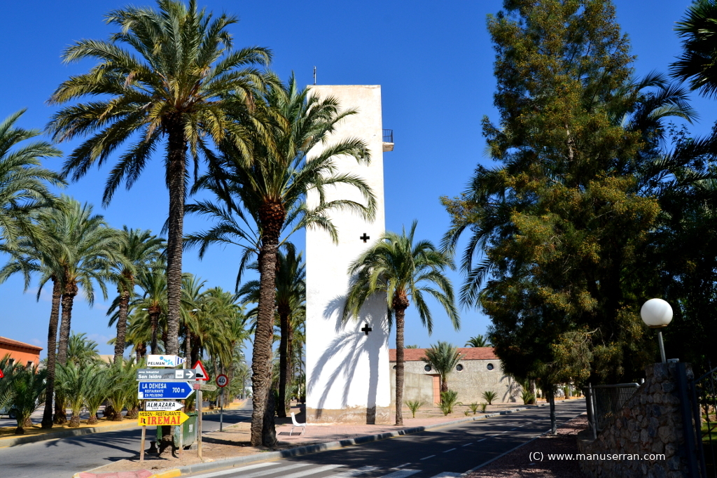 En una de las esquinas y el último piso se abre un balcón cuyo voladizo se adelanta al plano de la fachada alineada con la calle. La torre alcanza excepcional importancia plástica y actúa como hito visual del conjunto urbano, al ser muy perceptible desde el entorno casi llano de la huerta. En la fachada a la calle, coincidiendo con la altura del segundo piso hay un mural que fue realizado por Manuel Baeza, formado con teselas cerámicas representa la imagen figurativa de San Isidro, en cuanto que patrón de la iglesia parroquial y de la población.