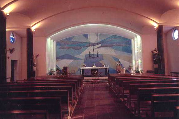 La pared que cierra el fondo del presbiterio presenta un mural del pintor alicantino Manuel Baeza, lo constituyen por pequeños teselas con mármol de diversos colores.