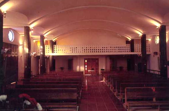 Las ventanas circulares tienen vidrieras policromadas con soportes estructurales formados con hormigón, los temas son figurativos muy simplificados, representan alegorías de carácter agrícola en concordancia al origen fundacional del poblado.