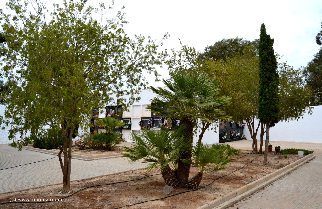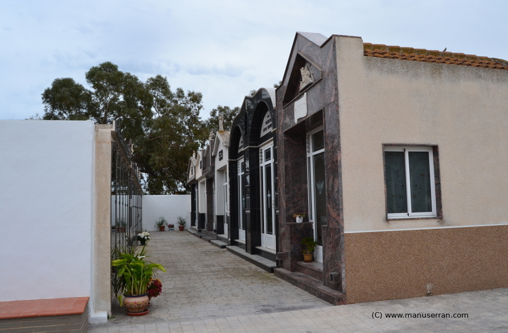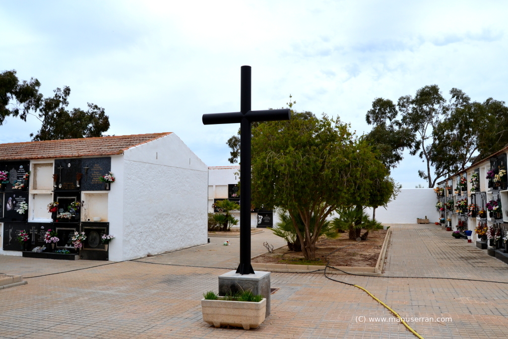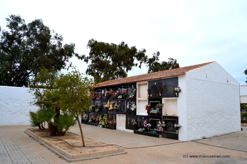El organismo de Colonización aspiraba, como en otras actuaciones, a proyectar y construir unidades autónomas en todos los aspectos, A tal efecto, San Isidro desde los comienzos tuvo cementerio con independencia del entonces existente en Albatera. Lo que pone de manifiesto la voluntad del organismo de Colonización de alcanzar una unidad urbana por completo autónoma, constituyendo un equipamiento más de San Isidro. Se encuentra situado junto a uno de los innumerables caminos que surcan aquella huerta. El recinto de enterramiento queda distribuido mediante una cuadrícula por completo inspirada en las soluciones tradicionales que tuvieron su origen en aquellos construidos durante el siglo XIX y con posterioridad. Las cercas están resueltas por medio de tapias opacas, destacando la presencia de la capilla y la torre con la espadaña, con volúmenes de gran sencillez. Siendo los muros acabados con tirolesa encalada…». (1)