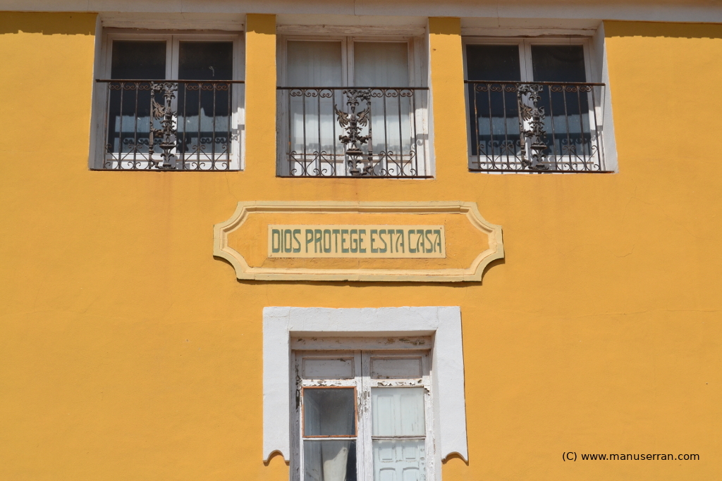 La fachada principal está ordenada mediante una serie de huecos de distinto tamaño en cada una de las plantas, con unas curiosas soluciones curvas en la planta del segundo piso. Los entrepaños están enfoscados y acabados en color ocre amarillo. En las esquinas existe un remate en falso almohadillado de escayola, presentando la pieza más alta un adorno en guirnalda.