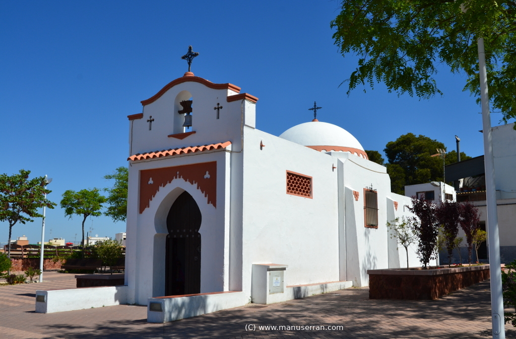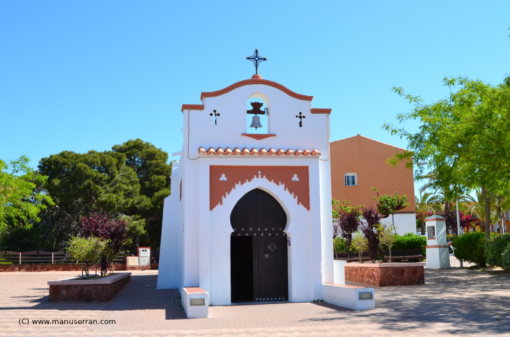 «…Conocida también como la ermita del Calvario. Sus orígenes podrían fecharse a lo largo del siglo XIX. Obviamente, aquella primigenia construcción no sería igual que el actual. Las escasas imágenes que se conservan, anteriores a la guerra de 1936-1939, la definen como una pequeña iglesia de características constructivas muy similares a la ermita del Cabo: blanca y de perfiles rectos, aunque de mayores dimensiones.