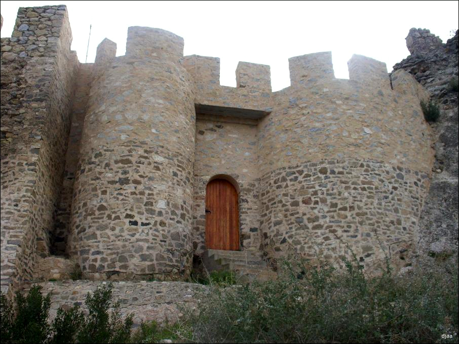 El camino de entrada está en la umbría de la peña, en medio de una refrescante pinada. Se accede a la fortaleza por su puerta original, aparecida durante los trabajos de restauración del castillo en 1983 y consolidada en 1999. Ésta se dispone entre dos cubos semicirculares. Todo el conjunto está trabajado en mampostería y es de planta muy similar al ingreso del cercano castillo de Villena, y a los castillos de Almansa y Chinchilla.