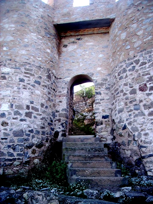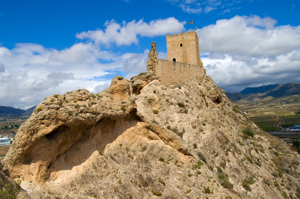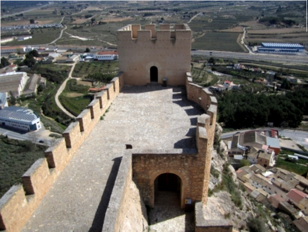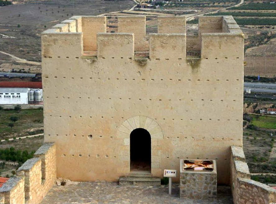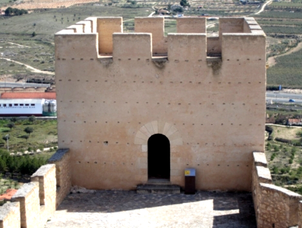 La extraordinaria torre del homenaje, estudiada por Azuar Ruiz, de tres plantas, de unos 15 metros de altura, de sillería encadenada en las esquinas y rellena de sillarejo, se emplaza a poniente, defendiendo la antigua puerta de acceso al recinto. Esa se situaba en altura, en su cara Oeste; era de medio punto en sillería y daba paso al patio de la plaza a través de un túnel recto, cubierto con bóveda de medio cañón. La primera sala se encuentra a la derecha de este corredor, con cubierta de bóveda de medio cañón. A la planta superior se accede por medio de una escalera con bóveda escalonada de arcos apuntados que discurre en el sentido de los muros y desemboca en una sala de planta cuadrangular con tres grandes ventanas de marcada embocadura. El conjunto de las torres se enlaza por medio de paños de muro de mampostería terminados en almenas con adarve y sin defensas aparentes para uso de la artillería. Entre estas dos torres podemos ver un aljibe cubierto con bóveda de medio cañón.