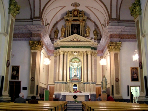«…Los orígenes del templo se remontan a 1588, aunque su estilo actual es neoclásico. Tiene planta de cruz latina, con tres tramos y capillas, sin cúpula, con una bóveda vaída sobre el presbiterio y coro añadido a los pies, en el primer tramo de la nave. La capilla de la Comunión está a un lado del altar mayor, cerrando el rectángulo de la planta. El templo fue quemado en 1936 y reconstruido posteriormente. Destaca el retablo clásico del altar mayor, con columnas corintias. Paredes de mampostería y cubiertas inclinadas de teja…». (4)