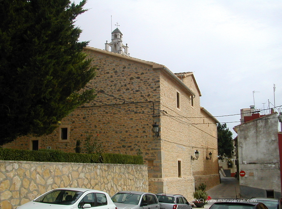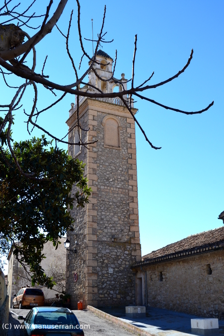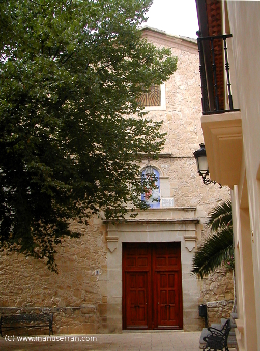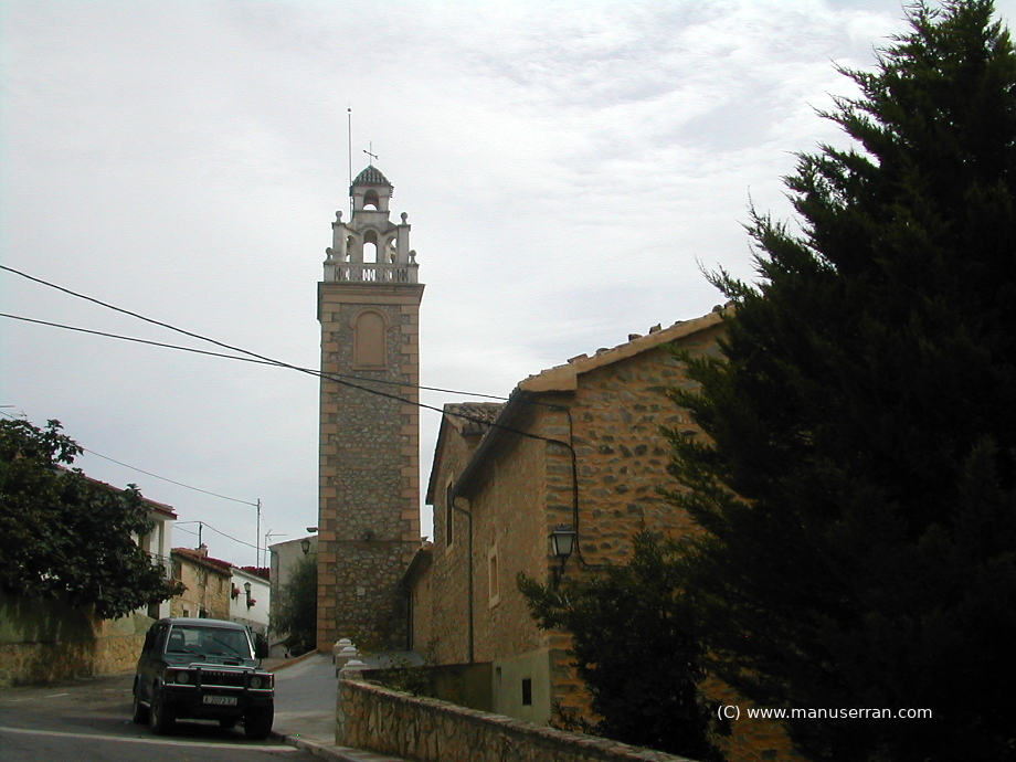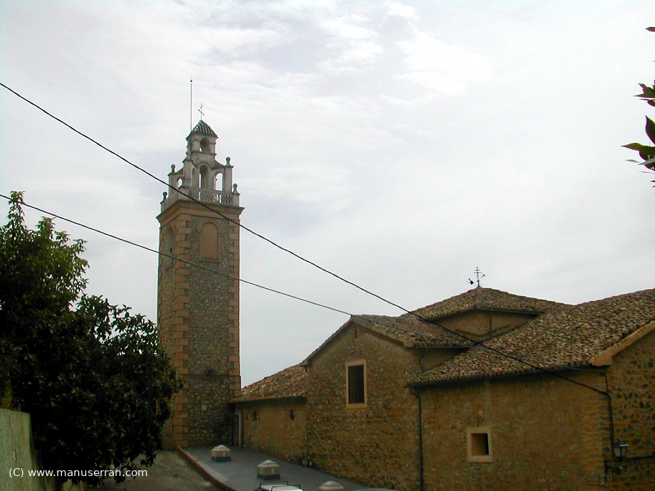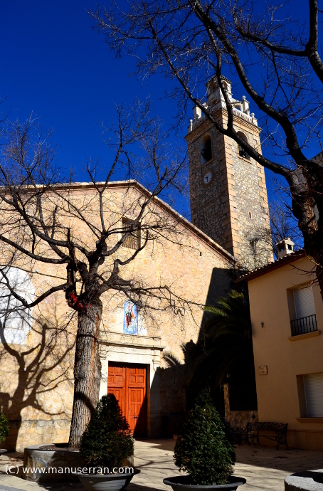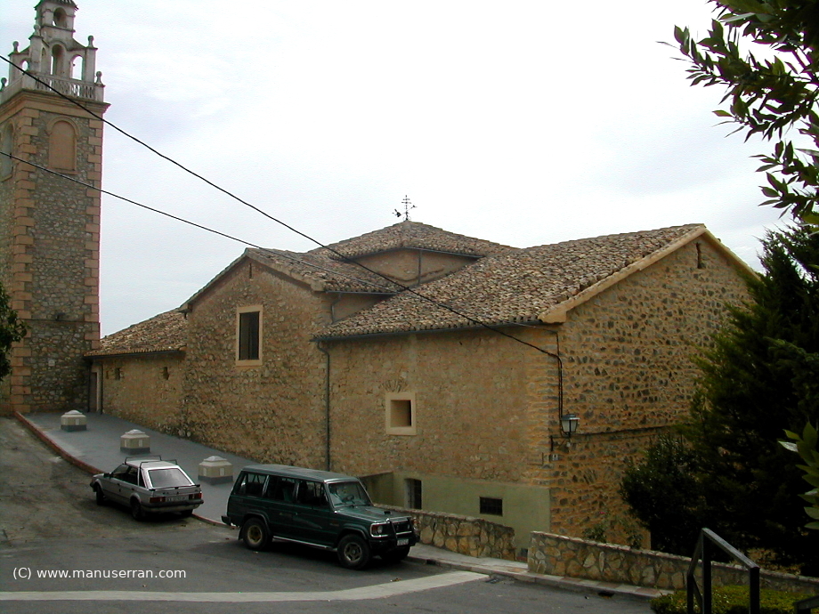 «…Los orígenes del templo se remontan a 1588, aunque su estilo actual es neoclásico. Tiene planta de cruz latina, con tres tramos y capillas, sin cúpula, con una bóveda vaída sobre el presbiterio y coro añadido a los pies, en el primer tramo de la nave. La capilla de la Comunión está a un lado del altar mayor, cerrando el rectángulo de la planta. El templo fue quemado en 1936 y reconstruido posteriormente. Destaca el retablo clásico del altar mayor, con columnas corintias. Paredes de mampostería y cubiertas inclinadas de teja…». (4)