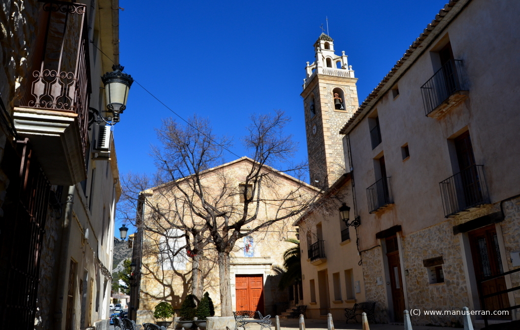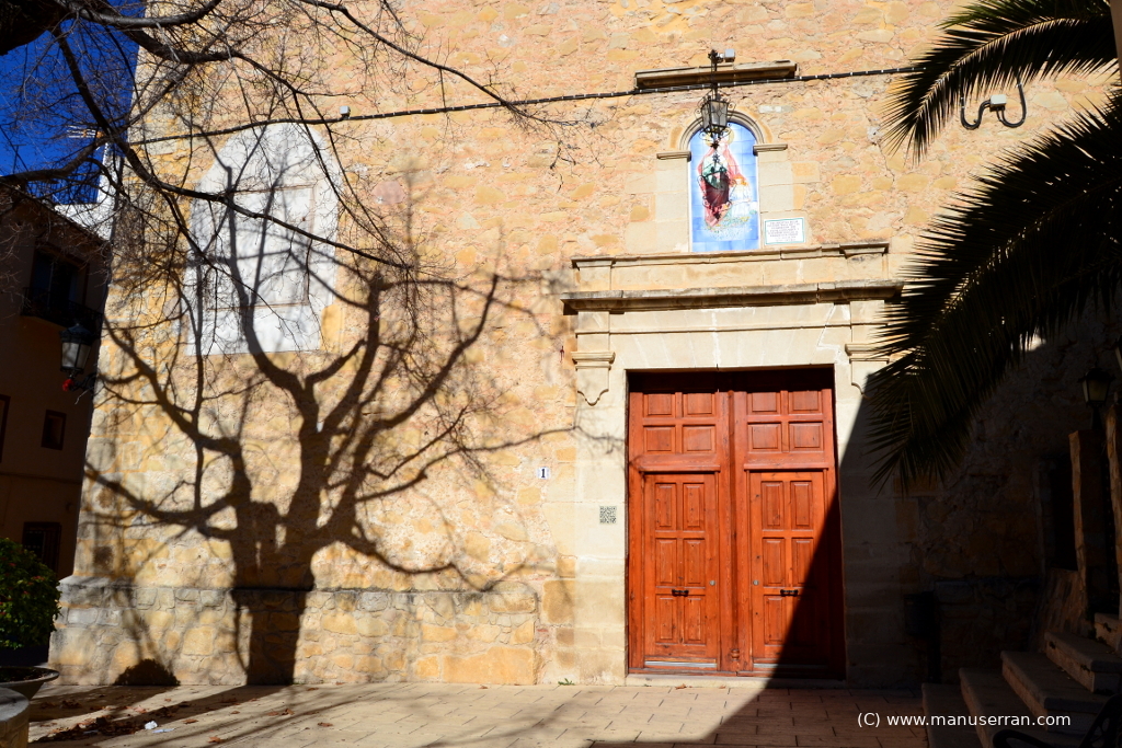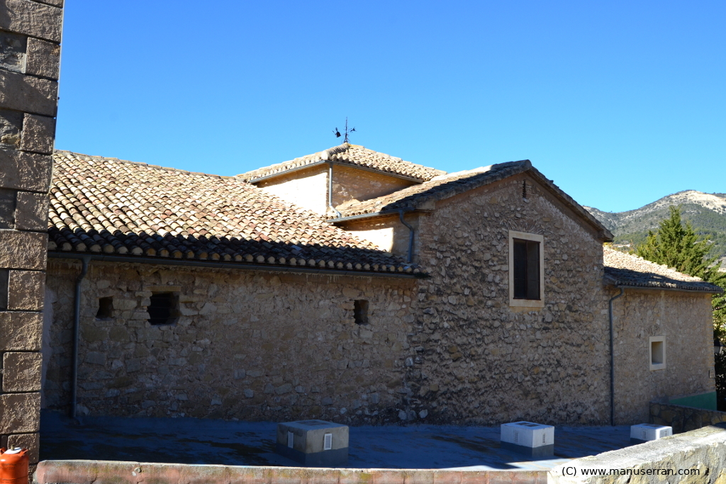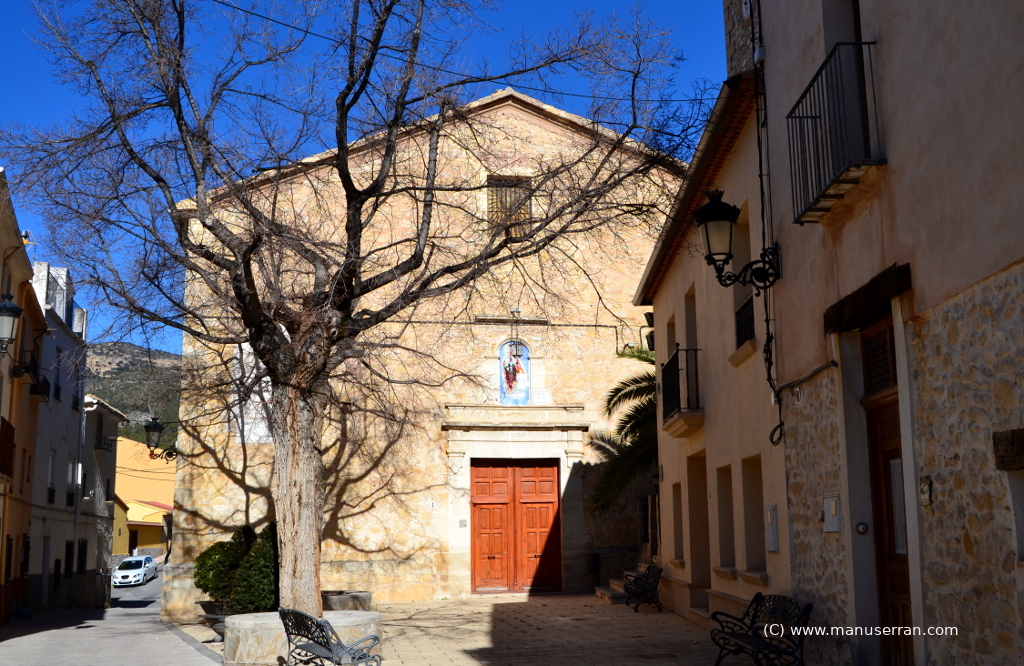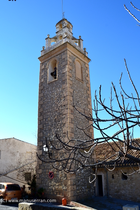 «…Los orígenes del templo se remontan a 1588, aunque su estilo actual es neoclásico. Tiene planta de cruz latina, con tres tramos y capillas, sin cúpula, con una bóveda vaída sobre el presbiterio y coro añadido a los pies, en el primer tramo de la nave. La capilla de la Comunión está a un lado del altar mayor, cerrando el rectángulo de la planta. El templo fue quemado en 1936 y reconstruido posteriormente. Destaca el retablo clásico del altar mayor, con columnas corintias. Paredes de mampostería y cubiertas inclinadas de teja…». (4)